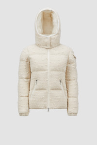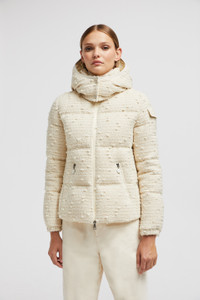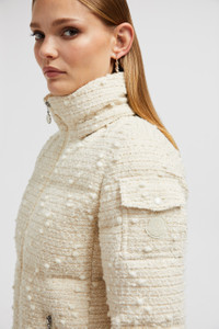 A classic Moncler down jacket for women, the Fourmines short puffer is reimagined in metallic tweed. Playing with texture, the Fourmines down jacket is crafted from boucle tweed interwoven with metallic thread. The warm fabric is supremely soft while boasting a unique finish that catches the light. Adapting to the weather, a detachable hood enhances the short puffer. A patch pocket on the sleeve completes the style, adding a touch of brand DNA. A luxurious addition to a cold weather wardrobe, the design elevates classic looks with its iridescent effect. DETAILS - Crafted from boucle tweed with metallic thread - Nylon leger lining - Down-filled - Detachable hood with knit trim - Zipped pockets - Sleeve pocket with snap button closure - Adjustable cuffs SIZE AND FIT - The model is wearing a size 0 and is 178 cm tall - The model measures: bust 80 cm, waist 60 cm, hips 88 cm - Slim fit COMPOSITION EXTERIOR: 42% Polyester, 19% Virgin wool, 15% Acrylic, 13% Cotton, 6% Polyamide / Nylon, 5% Viscose / Rayon; LINING: 100% Polyamide / Nylon; PADDING: 90% Down, 10% Feather Product code J20931A001605980UM11 Made in Romania