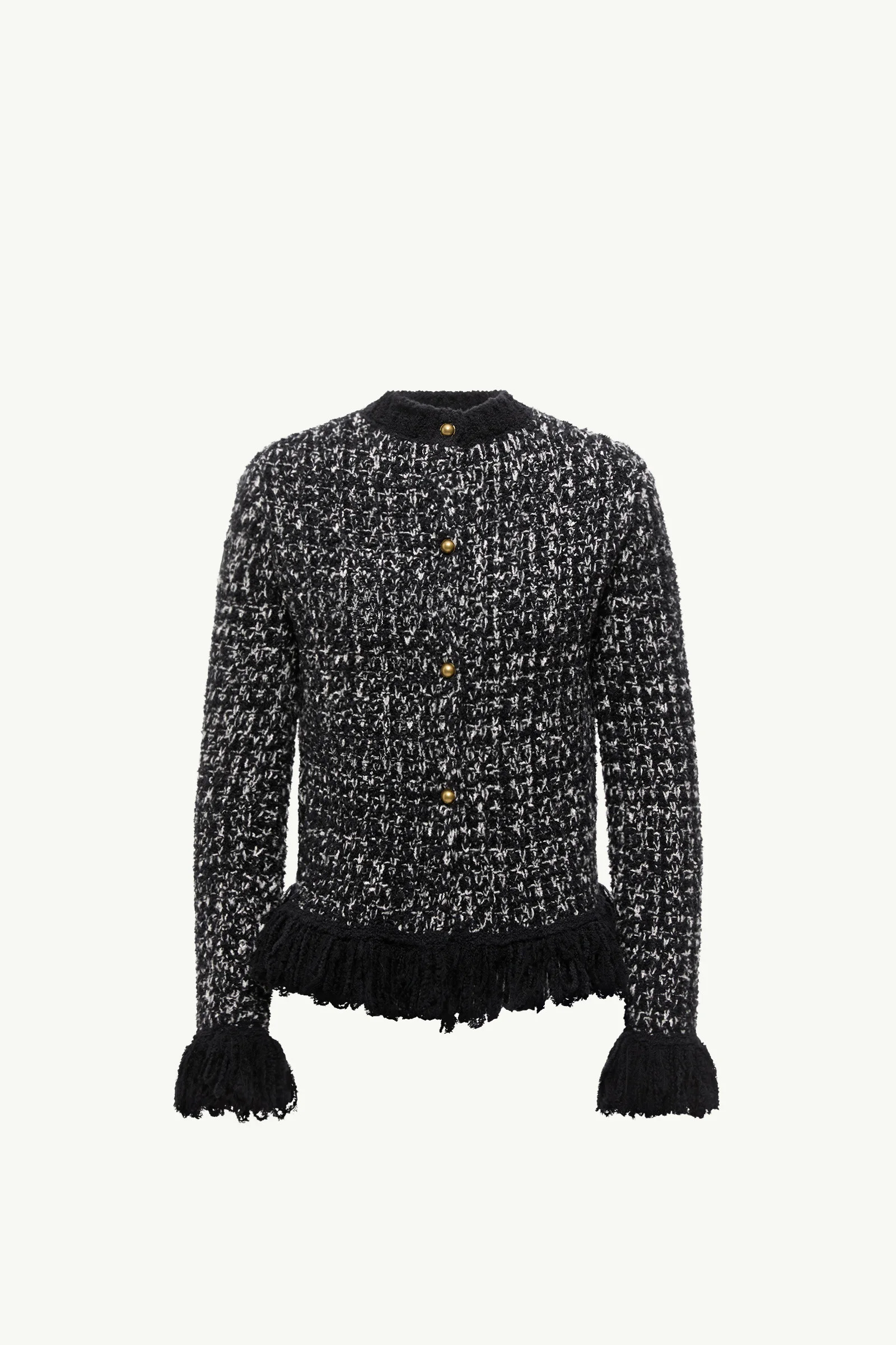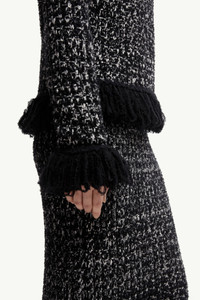 An interplay of unexpected textures, a fringed trim infuses this wool sweater for women with depth and softness. A study in sophisticated textures, this sweater pairs mouline wool with fringed accents. The heavy knit pairs effortlessly with a matching skirt, encapsulating cold weather elegance. DETAILS - Crafted from a wool, cotton and nylon blend - Mouline knit - Gauge 3 - Crew neck - Back snap button closure - Fringe trim - Leather logo patch SIZE AND FIT - The model is wearing a size XS and is 177 cm tall - Regular fit COMPOSITION BASE FABRIC: 68% Wool, 19% Polyamide / Nylon, 13% Cotton; 1 MATERIAL: 85% Wool, 15% Polyamide / Nylon;LEATHER TAG: CALF Product code K20939C00027M8319P90 Made in Italy