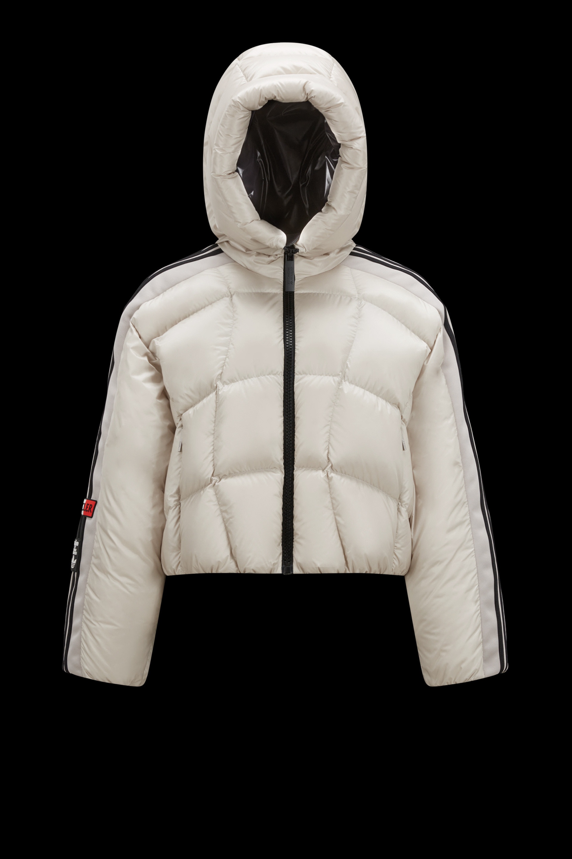Part of the Moncler x adidas Originals collection for women, the Fusine short down jacket embodies the spirit of sportsmanshipper with innovation and functionality. Emblematic of the Moncler x adidas Originals collection that revolves around exploration, the Fusine is a fresh take on a classic down jacket. Filled with warm down, it has a lightweight build and sleeves that snap shut. The quilting forms a wavy pattern that resembles the look of ski marks on snow-covered slopes. Iconic three stripes are the final touch. - Crafted from longue saison - Nylon laqué lining - Down-filled - Hood with nylon laqué lining - Sleeves with zipper and snap button closure - Three adidas stripes along the shoulders and sleeves - Zipper closure - Zipped outer pockets - Mesh inner pockets - Hem and cuffs with internal elastic - Silicone logo patches SIZE AND FIT - The model is wearing a size 2 and is 175 cm tall - The model measures: bust 59 cm, waist 87 cm, hips 40 cm - Oversized fit COMPOSITION AND CARE EXTERIOR: 100% Polyamide / Nylon; LINING: 100% Polyamide / Nylon; PADDING: 90% Down, 10% Feather; 1 MATERIAL: 100% Polyester Hand wash; Do not bleach; Do not tumble dry; Ironing maximum temperature 110°C - without steam; Do not dry clean; Do not professionally wet clean; Flat dry in the shade; Wash separately; Do not twist or wring; Do not iron decorations; Iron with a cloth between; do not soak; It is advisable to wash and iron the garment on reverse. Product code I209S1A00014M2287265 Made in Romania