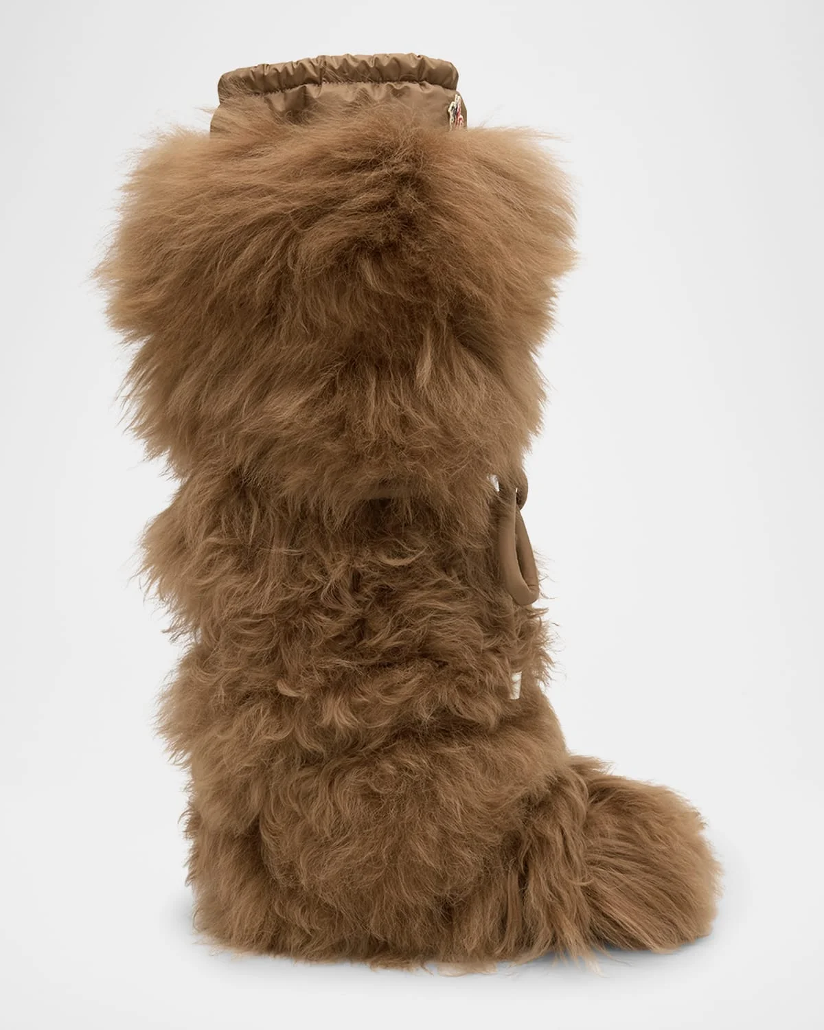 - Moncler "Gaia" shaggy dyed sheep shearling (Italy) and nylon tall snow boots - Flat heel - Round toe - Lace-up vamp - Rubber outsole - Lining: Polyester - Made in Italy