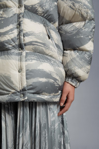 A women's design from the 4 Moncler HYKE collection, the Galenstockis is a down jacket characterized by a minimal aesthetic and a focus on function. Emblematic of the 4 Moncler HYKE collection, the Galenstockis down jacket displays a clean, utilitarian aesthetic. Merging minimal design and uttermost function, the printed puffer is enhanced with heat-sealed quilting and water-resistant zippers. The hooded down jacket comes in an oversized fit. - Crafted from micro ripstop léger - Recycled longue saison lining - Down-filled - Heat-sealed boudin quilting - Detachable hood - Collar with snap button closure - Snap button closure - Welt pockets with YKK® AquaGuard® Highly Water Resistant zipper closure - Elastic hem and cuffs - Silicone logo patch SIZE AND FIT - The model is wearing a size 0 and is 177 cm tall - The model measures: bust 77 cm, waist 60 cm, hips 85 cm - Oversized fit COMPOSITION AND CARE FRONT LINING: 100% Polyamide / Nylon; SLEEVES LINING: 100% Polyamide / Nylon; HOOD: 100% Polyamide / Nylon; PADDING: 90% Down, 10% Feather; DETAILS PADDING: 100% Polyester; BACK LINING: 100% Polyamide / Nylon; BASE FABRIC: 100% Polyamide / Nylon Wash max 30°C - Mild process; Do not bleach; Do not tumble dry; Ironing maximum temperature 110°C - without steam; Do not dry clean; Professional wet cleaning - mild process; Flat dry in the shade; Wash separately; Do not iron decorations; do not soak; It is advisable to wash and iron the garment on reverse. Product code H209K1A00002M2561F92 Made in Romania