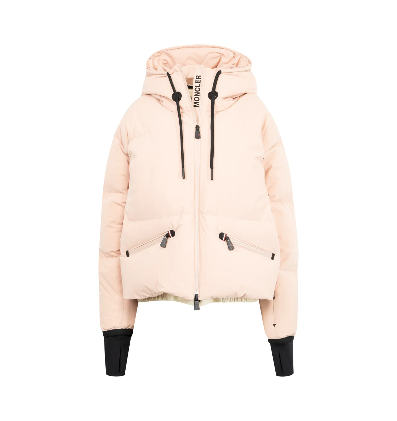 MONCLER Allesaz Hooded Down Ski Jacket featuring 2L four-way stretch technical poplin, stretch nylon lining, down-filled, heat-sealed seams, adjustable hood with 2L four-way stretch technical poplin lining, YKK® Aquaguard highly water-resistant zipper closure, pockets with YKK® Aquaguard highly water-resistant zipper closure, inner media pocket with YKK® Aquaguard highly water-resistant zipper closure, inner stretch mesh pocket, ski pass pocket, powder skirt, RECCO® reflector, stretch jersey wrist gaiters, hem with drawstring fastening, logo details and silicone logo patch. 84% polyamide/nylon, 16% elastane/spandex. Padding: 90% down, 10% feather. Made in Romania. DESIGNER STYLE ID: 1A000-56-597S3 COLOR: 511 TAN