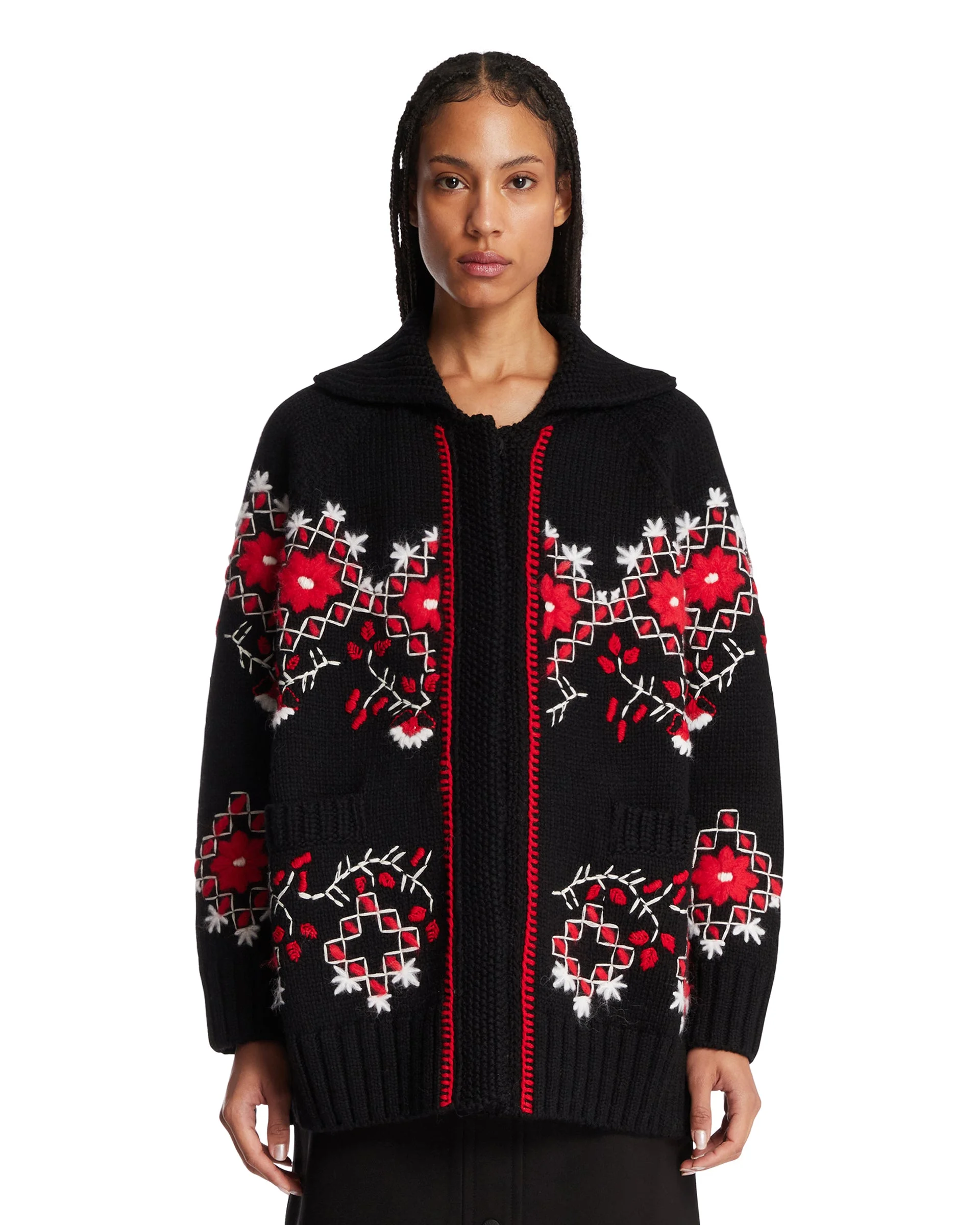 Moncler Grenoble Black Embroidered Wool Cardigan. Black wool blend, contrasting floral motif, long sleeves, snap-button closure, flap pockets, relaxed fit. Faelly is 178 cm and she is wearing size S. DETAILS Model: 9B00005M3131999 Composition: 79% Virgin Wool, 21% Polyamide Made in: ITALY Season: FW25-26