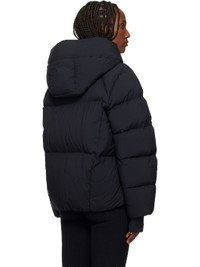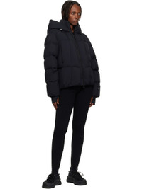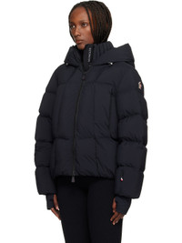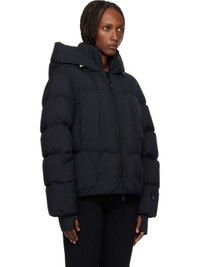Down-filled and quilted nylon taffeta jacket. · DIST-certified down · Bungee-style drawstring at hood · Stand collar · Two-way zip closure · Seam pockets at front · Bungee-style drawstring at elasticized hem · Embroidered logo patch and zip pocket at sleeve · Thumbhole at inset jersey cuffs · Zip pocket and powder skirt at interior · Full satin lining Supplier color: Black Body: 100% polyamide. Trim: 83% polyamide, 17% elastane. Fill: 90% goose down, 10% feather. Lining: 100% polyester. Made in Italy 252826F061001