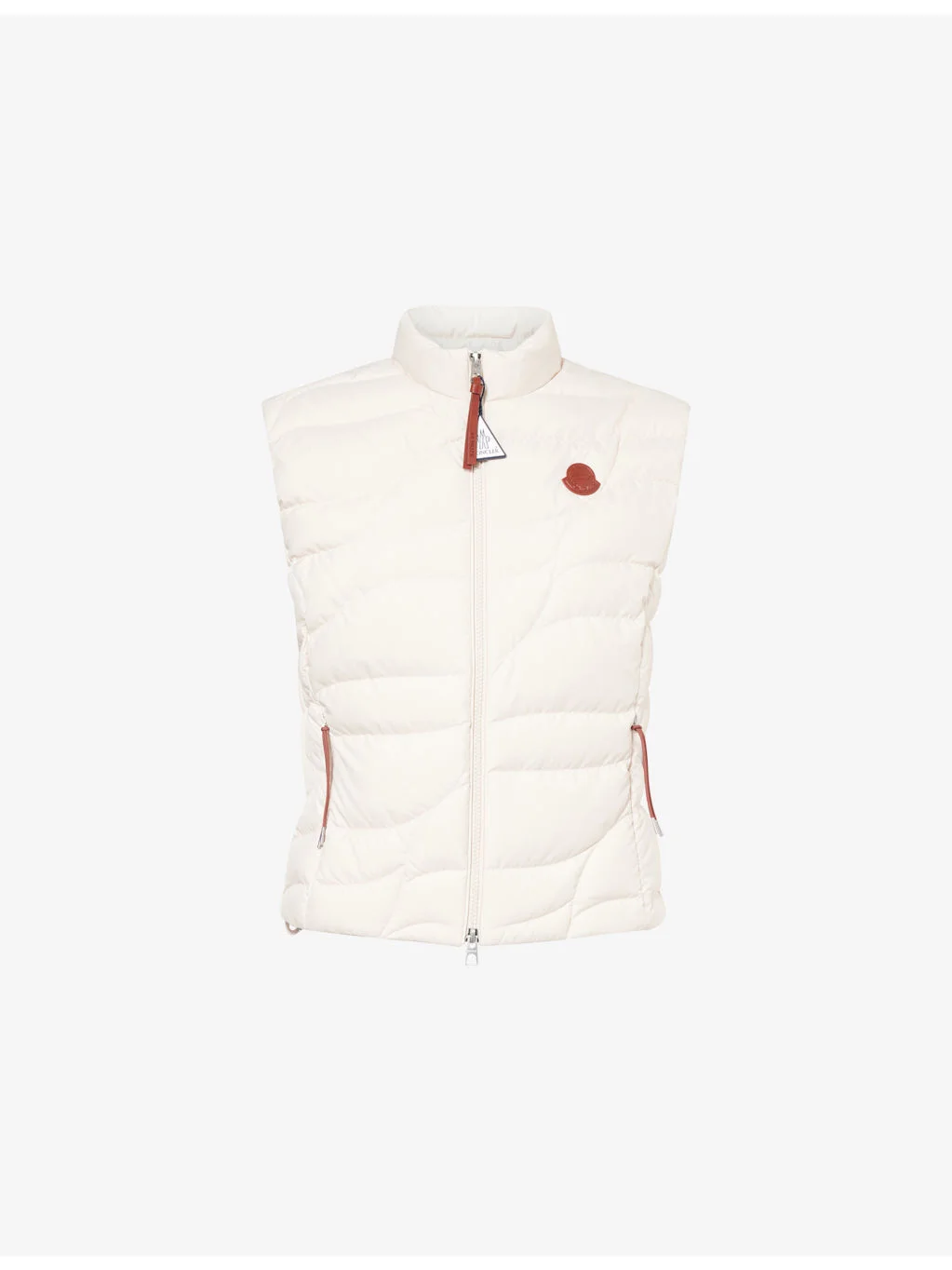 PRODUCT DETAILS - Moncler shell-down gilet - 100% polyester; filling 90% down, 10% feathers; lining 100% polyester - Exposed zip fastening at front - Regular fit, high neck, sleeveless, leather logo badge at chest, two side zip pockets with tie pullers, quilted - Hand wash - Made in Romania - True to size - Size small: length 22in / 56cm - Model is 5ft 10in/1.78m and wears a size small - Lightweight, non-stretch Ref: R04566902