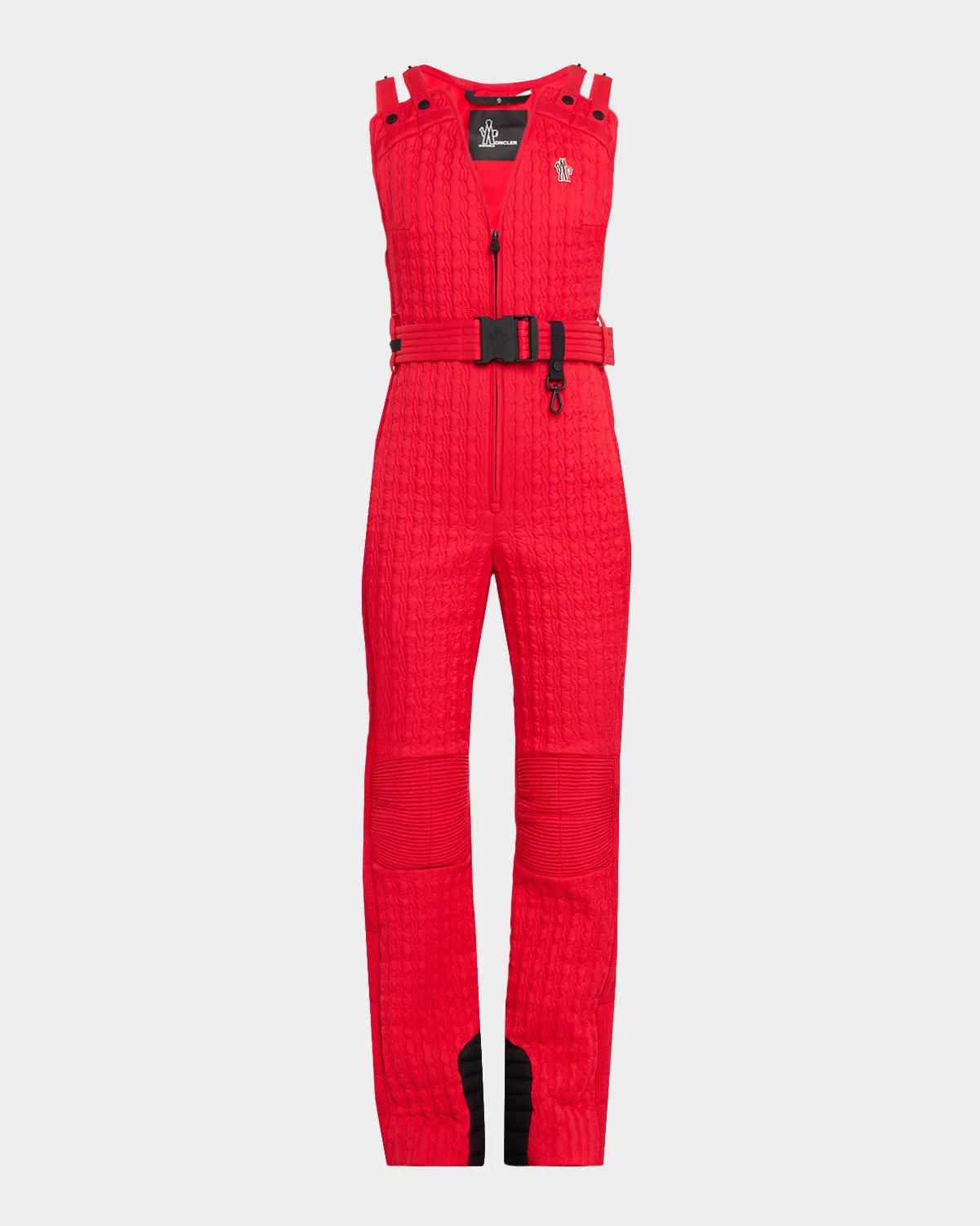 Crafted from signature longue saison with a waterrepellent finish, this ski suit from the Moncler Grenoble Collection boasts intricate quilting with downfilled insulation for comfort on and off the slopes. Features a signature embroidered logo patch on the chest V neckline Sleeveless; adjustable shoulder snaps Detachable belt with glove carabiner Fitted bodice Straight legs with skicut hem protection YKK® AcquaGuard® highly waterresistant zipfront Nylon/polyamide Fill: Down/feather Machine wash cold Imported