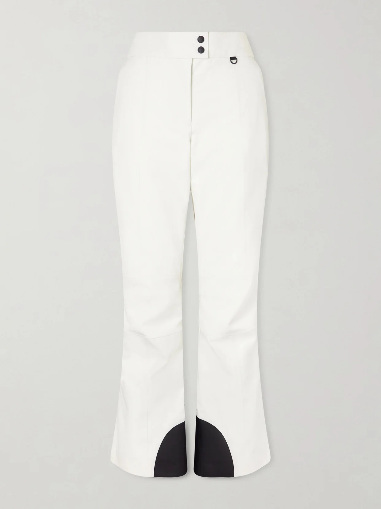 Moncler Grenoble's new skiwear collection focuses on lighter fabrications, and each piece is performance-tested by winter sports experts. These white flared pants are made from durable water-resistant shell and cut for a slim fit. Functional features include padded knees, a higher cut back for warmth and coverage, and zipped cuffs so you can adjust them to fit over your boots. Shown here with: [Moncler Grenoble ski jacket id929469], [Moon Boot Boots id910214], [Allude Sweater id942316].