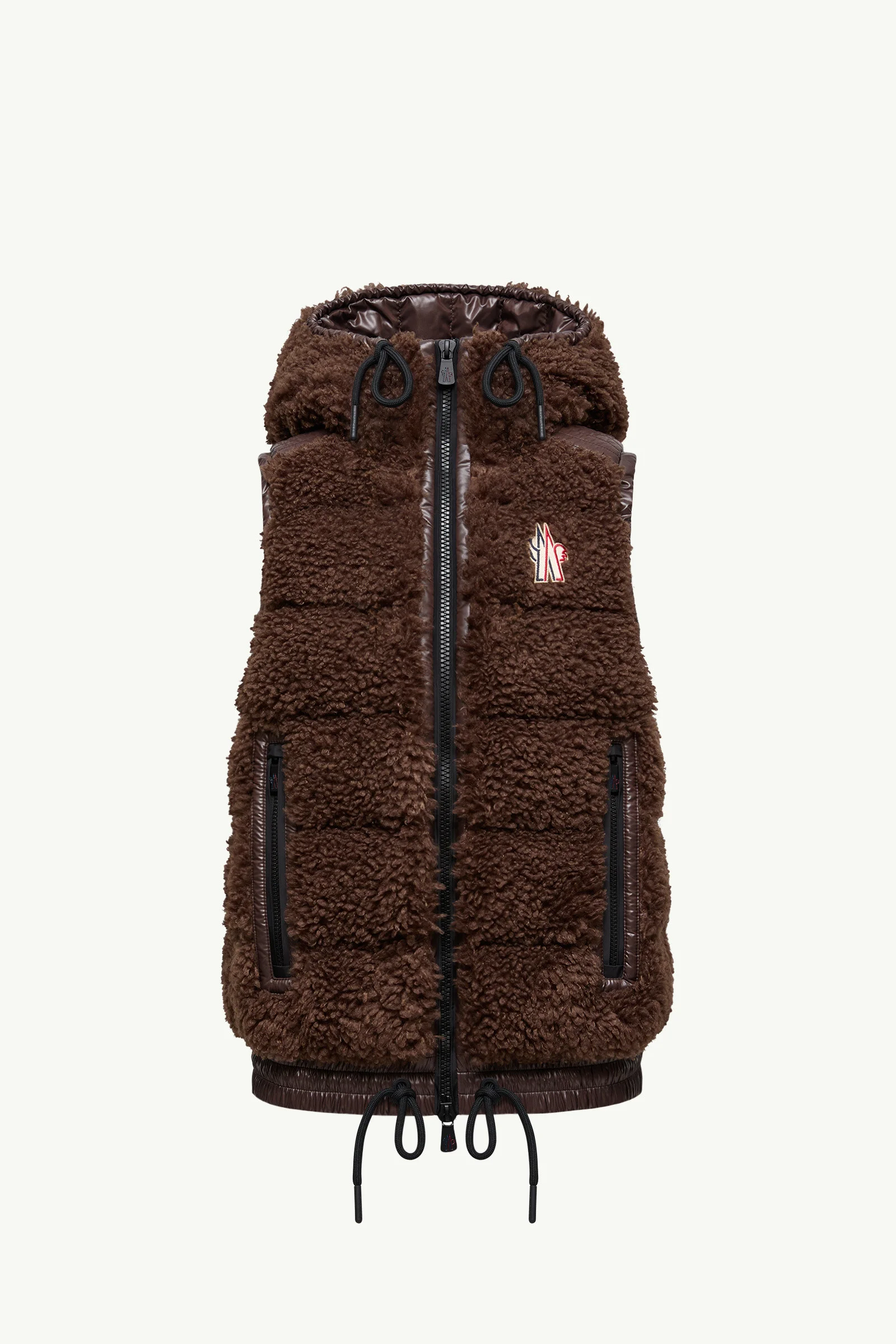 Encapsulating an apres ski mood, this down vest from the women's Moncler Grenoble collection is crafted from teddy fleece. Crafted from plush teddy fleece, this down vest adds a touch of luxury to moments of winter leisure. The warmer is enriched with a trim in nylon laque, a signature Moncler fabric notable for its glossy texture and water-repellent protection. An adjustable hood completes the design. DETAILS - Designed for trekking and hiking - Crafted from teddy fleece - Nylon laque shoulders and trim - Nylon laque lining - Down-filled - Adjustable hood - Zipper closure - Zipped pockets - Hem with elastic drawstring fastening SIZE AND FIT - The model is wearing a size S and is 178 cm tall - Regular fit COMPOSITION BASE FABRIC: 100% Polyester; 1 MATERIAL: 100% Polyamide / Nylon; 2 MATERIAL: 100% Polyamide / Nylon; LINING: 100% Polyamide / Nylon; HOOD LINING: 100% Polyamide / Nylon; PADDING: 90% Down, 10% Feather; DETAILS PADDING: 100% Polyester Product code K20988G00014899A9273 Made in Moldova