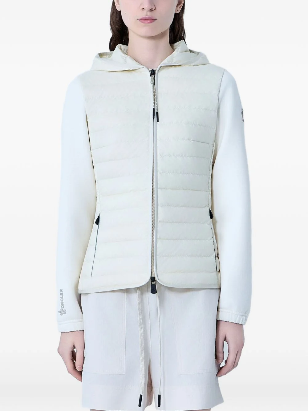 hooded quilted jacket Highlights - White - Full zip closure - Long sleeves - Side zip pockets - Quilted panel - Hood Imported Composition Outer: Polyamide 100%, Polyester 76%, Viscose 18%, Elastane 6% Lining: Polyester 100%, Down 90%, Feather 10% Washing instructions Read Manufacturer Guidelines
