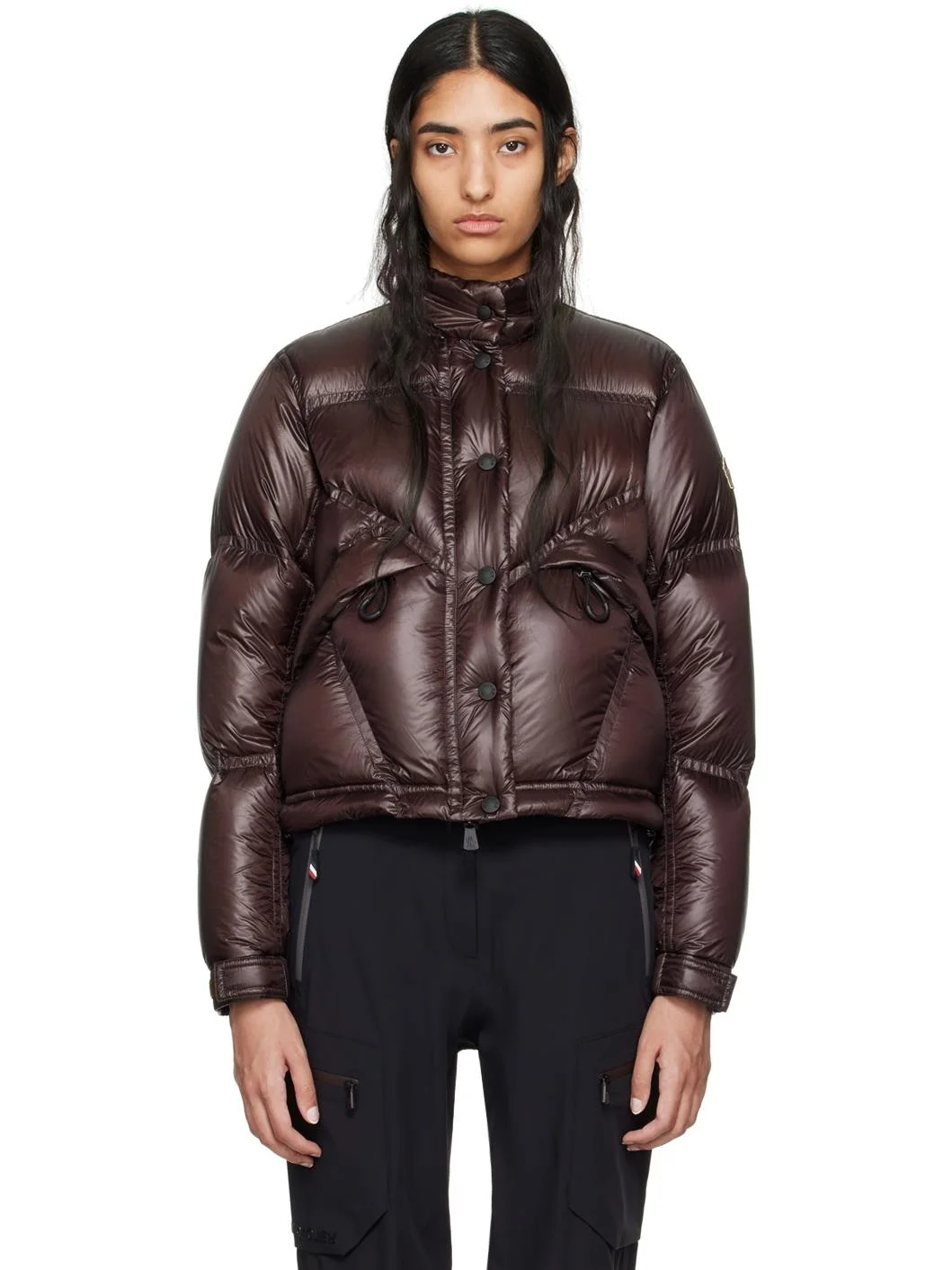 Packable DIST-certified down-filled and quilted nylon ripstop jacket. Windproof, water-repellent, and breathable. · Stowaway hood at stand collar · Two-way zip closure with press-stud placket · Zip pockets · Bungee-style drawstring at hem · Embroidered logo patch at sleeve · Adjustable velcro tab at elasticized cuffs · Storm flap and reflective logo patch at back yoke · Zip pocket at back · Reflective text at back hem · Full quilted nylon laque lining Part of the Day-Namic collection. Supplier color: Brown Fill: 90% goose down, 10% feather. Body: 100% polyamide. Lining: 100% polyamide. Made in Italy 242826F061010