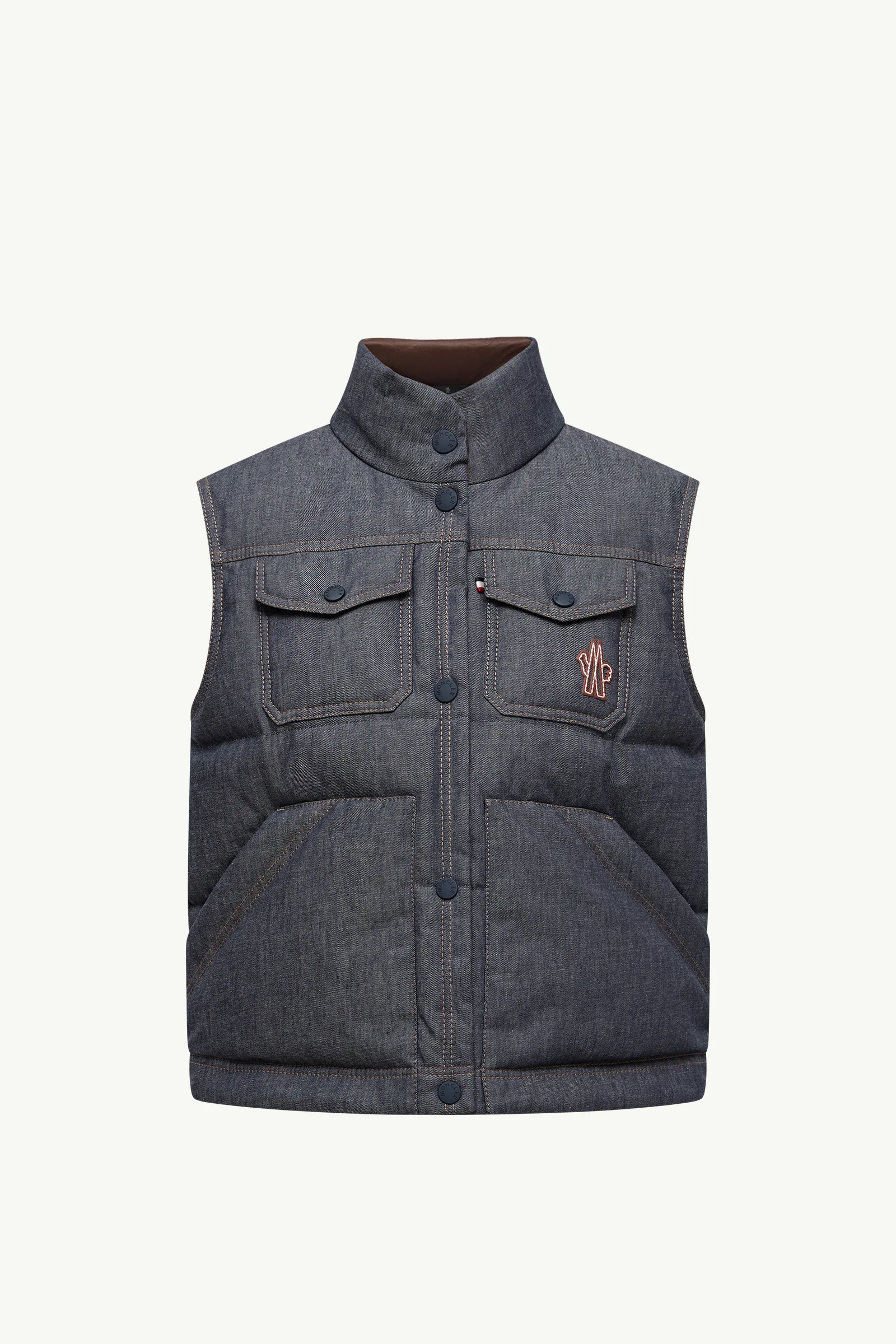 Bringing innovative fabrics to the fore, the Moncler Grenoble Knysna down vest for women reimagines classic denim with a technical twist. Reinventing a cult fabric, the Knysna down-filled vest is a contemporary take on casual winter outerwear. The puffer is crafted from an innovative type of denim, made technical through an advanced two-layer construction. Helping keep the elements at bay, the warmer is completed by water-resistant pockets. DETAILS - Crafted from 2L technical denim - Rainwear lining - Ultrasuede®nu collar and trim - Down-filled - Snap button closure - Pockets with YKK® AquaGuard® Highly Water Resistant zipper closure - Inner media pocket with YKK® AquaGuard® Highly Water Resistant zipper closure - Synthetic material logo patch SIZE AND FIT - The model is wearing a size 1 and is 178 cm tall - Regular fit - Length (collar to hem): 56 cm COMPOSITION BASE FABRIC: 100% Cotton; LINING: 100% Polyamide / Nylon; COLLAR: 100% Polyester; PADDING: 90% Down, 10% Feather; DETAILS PADDING: 100% Polyester Product code K20981A00007598RR989 Made in Romania