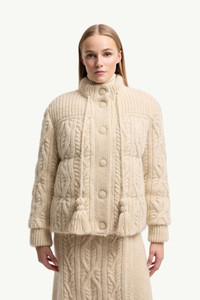 An ode to traditional knits, the women's Moncler Grenoble Melgven short down jacket combines different stitching patterns for a textured effect. Drawing from classic knitwear designs, the Melgven intertwines intricate ornamentation with soft textures. The short down jacket is crafted from a wool, mohair and nylon blend, imbued with a tactile finish that recalls tweed. A whimsical finishing touch, tassels complete the design. DETAILS - Crafted from a wool, mohair and nylon blend - Rainwear lining - Down-filled and padded - Gauge 1.5 and 3 - High neck - Snap button closure - Side pockets SIZE AND FIT - The model is wearing a size S and is 178 cm tall - Regular fit COMPOSITION BASE FABRIC: 76% Wool, 14% Mohair, 10% Polyamide / Nylon; LINING: 100% Polyamide / Nylon; PADDING: 90% Down, 10% Feather; DETAILS PADDING: 100% Polyester Product code K209G9B00001M8540051 Made in Romania