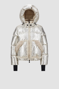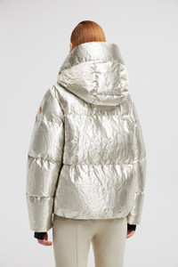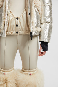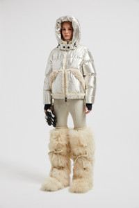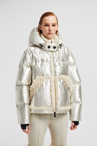 Encapsulating chalet style, the Moncler Grenoble Trevelin short puffer jacket for women features a plush shearling collar and trim. A sophisticated piece for apres ski, the Trevelin short down jacket is crafted from lame with a shiny finish. The hooded puffer is further enhanced by a shearling collar and trim, enhancing moments of winter leisure with a luxurious note. Adding protection, a powder skirt completes the warmer. DETAILS - Crafted from lame - Nylon laque lining - Shearling collar and trim - Down-filled - Adjustable hood - Zipper closure - Inner pockets with YKK® Aquacheat® water-repellent look zipper closure - Powder skirt - Stretch jersey wrist gaiters - Elastic trim SIZE AND FIT - The model is wearing a size 1 and is 179 cm tall - The model measures: bust 80 cm, waist 60 cm, hips 88 cm - Loose fit COMPOSITION BASE FABRIC: 53% METALLIZED FIBER, 47% Polyester; LINING: 100% Polyamide / Nylon; PADDING: 90% Down, 10% Feather; DETAILS PADDING: 100% Polyester; 1 MATERIAL: 83% Polyamide / Nylon, 17% Elastane / Spandex;Leather with hair 1: SHEEP; Leather with hair 2: SHEEP Product code J20981A000445975PM10 Made in Italy