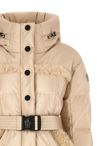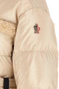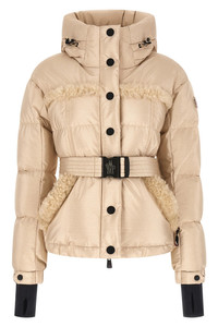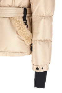 cod. K20981A00020598UZM10 'Mondim' ski jacket made of quilted water-repellent metallized fabric with tone-on-tone long-haired sheepskin inserts, goose down padded polyester lining, adjustable hood, high neck, YKK® AquaGuard® Highly Water Resistant zip closure and front snap buttons, pockets, long sleeves with windproof gaiter and applied logo patch, elastic back waistband, inner gaiter on the hem. Removable belt with glove hook detail. Color: Gold Size & Fit: true to size fit Composition: 83% polyamide, 17% elastane Made in: Romania