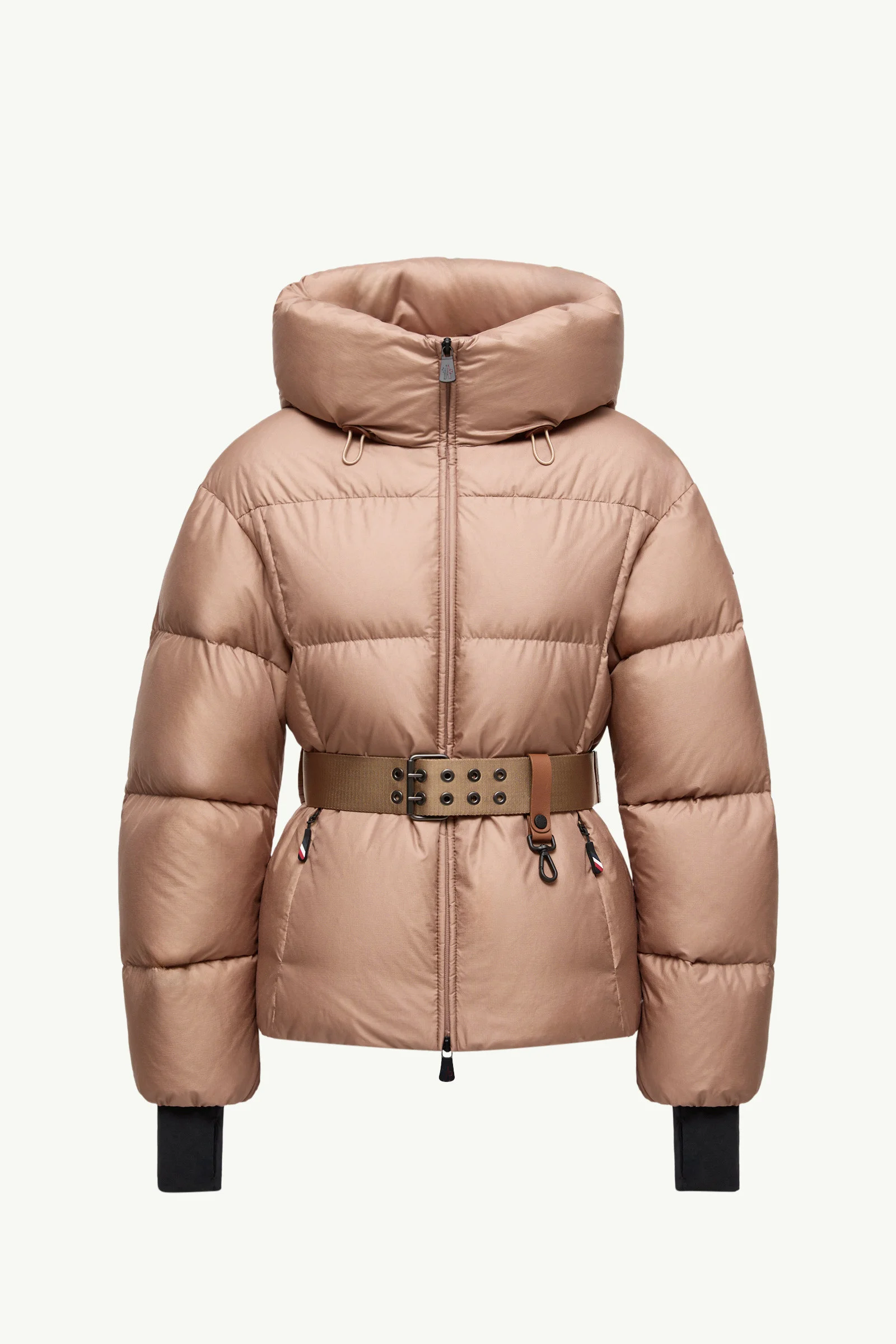 Mountain leisure is encapsulated in the Nisene short down jacket from the women's Moncler Grenoble collection. The perfect companion for mountain getaways, the Nisene down jacket is crafted from ultra-lightweight nylon ripstop. The short puffer is further enhanced with an adjustable hood and powder skirt, keeping the snow at bay. Creating a feminine shape while remaining functional, a belt with a hook for gloves completes the warmer. DETAILS - Crafted from micro ripstop - Polyester lining - Down-filled - Adjustable hood with micro ripstop lining - Water-repellent look zipper closure - Zipped pockets - Inner media pocket with water-repellent look zipper closure - Belt with glove carabiner - Powder skirt - Stretch jersey wrist gaiters - Logo detail SIZE AND FIT - The model is wearing a size 1 and is 177 cm tall - Regular fit - Belted - Length (collar to hem): 63 cm COMPOSITION BASE FABRIC: 100% Polyamide / Nylon; LINING: 100% Polyester; PADDING: 90% Down, 10% Feather; DETAILS PADDING: 100% Polyester; 1 MATERIAL: 83% Polyamide / Nylon, 17% Elastane / Spandex;LEATHER EXTERIOR: COW Product code K20981A00008598E0513 Made in Romania