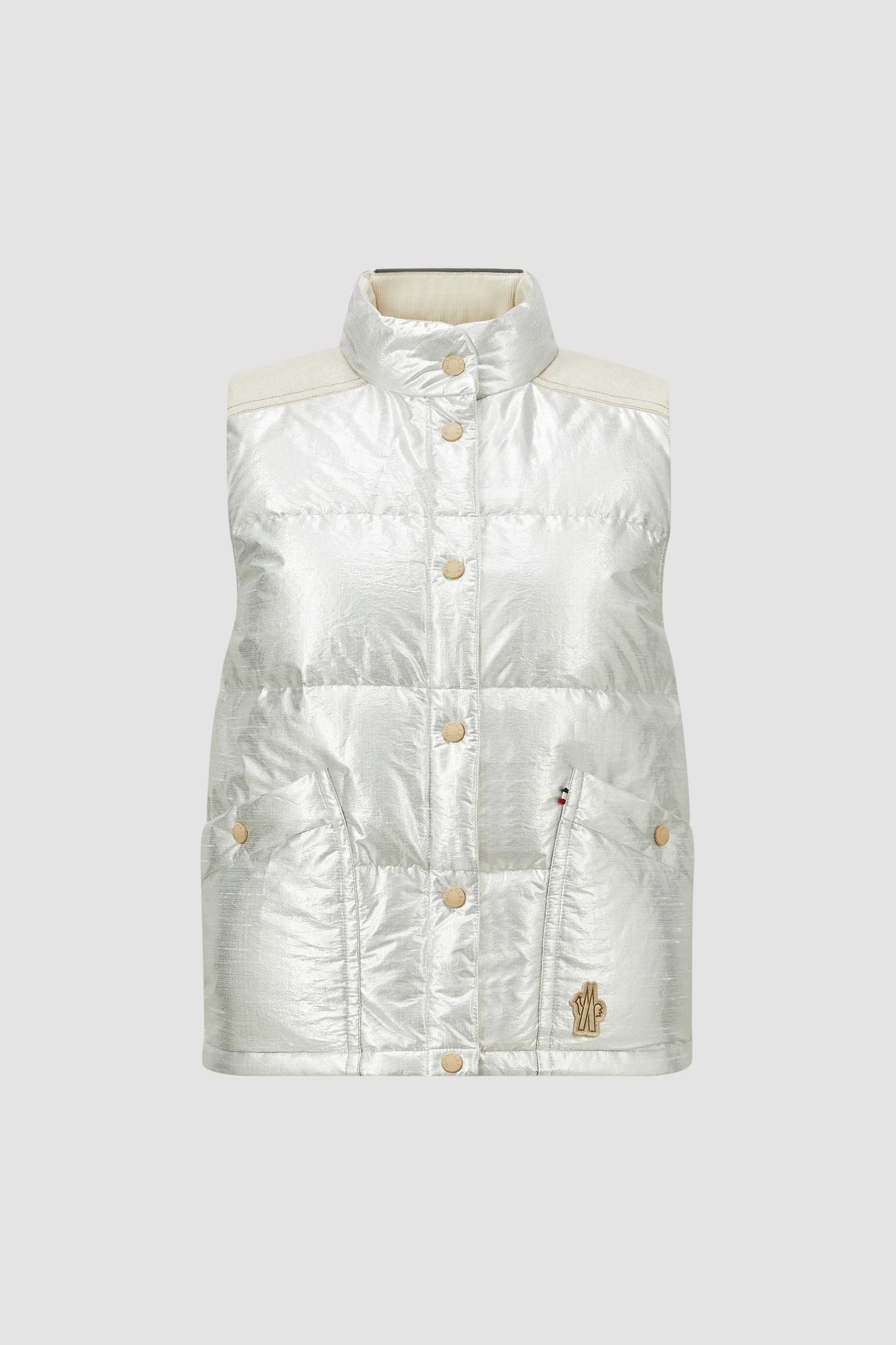 Boasting a bold iridescent effect, the women's Moncler Grenoble Pinchot down vest fuses outdoor performance with style. Fit for a range of outdoor activities, the Pinchot down vest highlights innovative materials. Crafted from lame, the puffer vest feels soft to the touch while boasting a metallic finish. The warmer is enhanced with a cotton and linen yoke, adding lightweight resistance. DETAILS - Designed for outdoor activities - Crafted from polyester blend lame - Cotton twill lining - Down-filled - Collar with velvet and linen lining - Linen and cotton blend yoke - Snap button closure - Pockets with snap button closure - Logo patch SIZE AND FIT - The model is wearing a size 1 and is 178 cm tall - The model measures: bust 74 cm, waist 61 cm, hips 85 cm - Regular fit COMPOSITION BASE FABRIC: 69% Polyester, 31% METALLIZED FIBER; LINING: 100% Cotton; PADDING: 90% Down, 10% Feather; 1 MATERIAL: 52% Cotton, 48% Flax/Linen; 2 MATERIAL: 80% Cotton, 20% Flax/Linen Product code K10981A00005598DDM90 Made in Romania