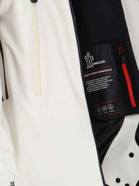 MONCLER GRENOBLE 'CHANAVEY' SKI JACKET IN WHITE WATER-REPELLENT GORE-TEX FABRIC WITH HOOD, HIGH NECK, DOUBLE ZIP CLOSURE, TWO FRONT ZIP POCKETS, EMBROIDERED LOGO PATCH ON THE SLEEVE, ONE ZIP POCKET ON THE SLEEVE, ONE INNER ZIP POCKET, INNER SNAP BUTTON CLOSURE, CUT-OUT DETAIL ON THE CUFFS, STRAIGHT HEM. PRODUCT INFO PRODUCT CODE 098 1A000 06 598P5036 COMPOSITION: 83% POLYAMIDE, 17% ELASTANE SIZE AND FIT: REGULAR FIT MADE IN: ROMANIA - PADDING: 90% DOWN, 10% FEATHER