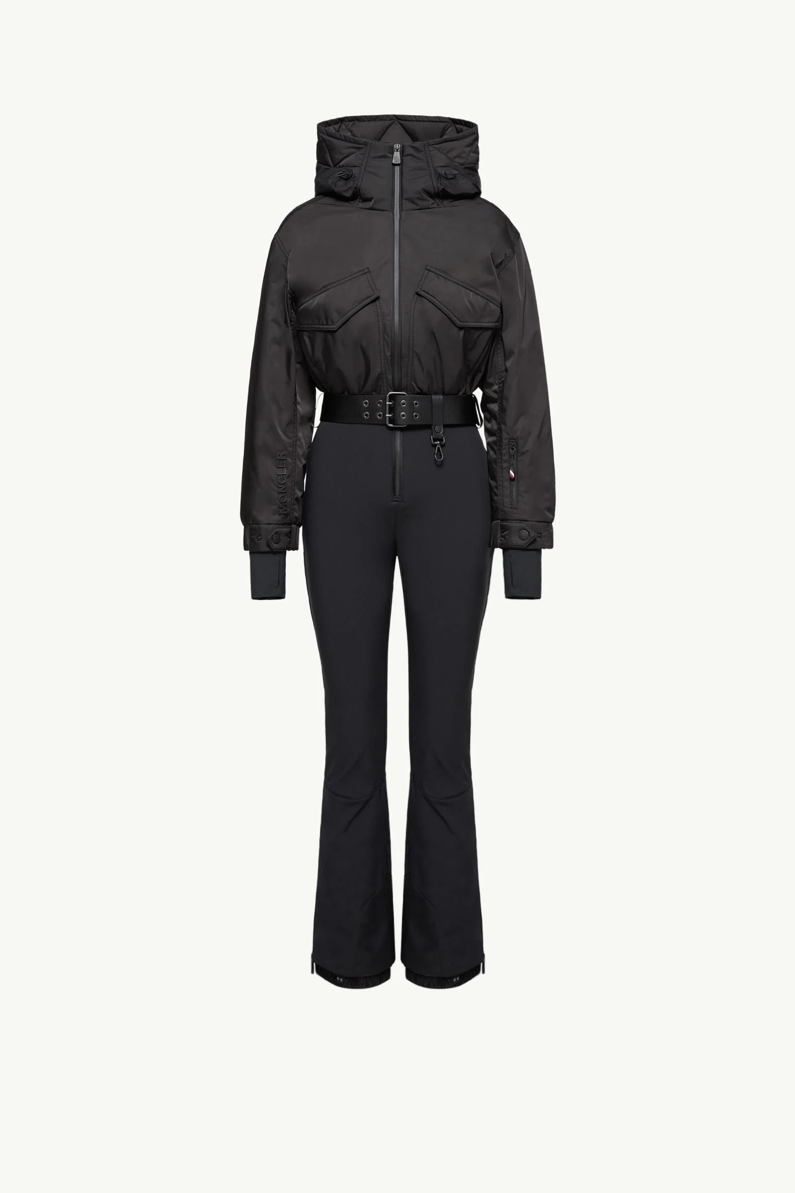 A fusion of comfort and style, this women's Moncler Grenoble ski suit is optimized for warmth and ease of movement on the slopes. A high-altitude style, this ski suit is crafted from technical poplin that stretches four ways for maximum freedom of movement. A true essential for the mountains, powder cuffs and hem protection complete the design. DETAILS - Designed for skiing and snowboarding - Crafted from 3L 4-way stretch technical poplin - Body, sleeves and hood in micro gabardine - Polyester and technical polyester lining - Down-filled and padded - Adjustable hood with teddy lining - YKK® AquaGuard® NATULON® water-repellent zipper closure - Detachable belt with leather details - Pockets with YKK® AquaGuard® NATULON® water-repellent zipper and snap button closure - Ski pass pocket with YKK® AquaGuard® NATULON® water-repellent zipper closure - Powder cuffs - Ski cut hem protection - Stretch jersey wrist gaiters COMPOSITION BASE FABRIC: 68% Polyester, 24% Polyamide / Nylon, 8% Elastane / Spandex; BODY LINING: 100% Polyester; HOOD LINING: 100% Polyester; SLEEVES LINING: 89% Polyester, 11% Elastane / Spandex; BOTTOM LINING : 100% Polyamide / Nylon; PADDING: 90% Down, 10% Feather; DETAILS PADDING: 100% Polyester; 1 MATERIAL: 100% Polyester; 2 MATERIAL: 100% Polyamide / Nylon; 3 MATERIAL: 83% Polyamide / Nylon, 17% Elastane / Spandex;LEATHER EXTERIOR: COW Product code K20982G00006M7340999 Made in Romania