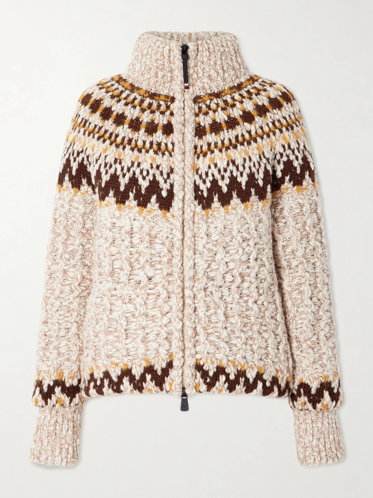 Moncler Grenoble's cardigan is jacquard-woven with a bolder take on a traditional Fair Isle pattern. Made from a wool-blend with a chunky handle, it's filled with insulating down and has a cozy funnel neckline. Use the two-way zip fastening to adjust the coverage.