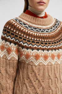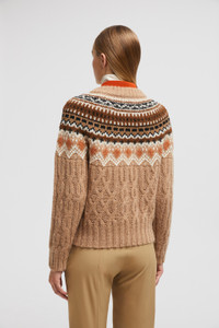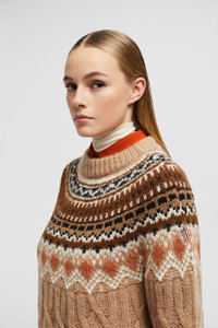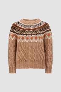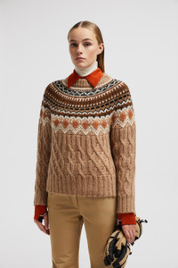 A nod to classic alpine leisurewear, this Moncler Grenoble sweater for women features a whimsical jacquard pattern. Adding a touch of luxury to a relaxed winter wardrobe, this crew neck sweater is crafted from a wool, mohair and alpaca blend. The heavy knit is completed by a graphic jacquard motif. DETAILS - Crafted from a carded wool, mohair and alpaca blend - Diamond and cable pattern jacquard knit - Gauge 1.5 - Crew neck - Embroidered logo SIZE AND FIT - The model is wearing a size S and is 178 cm tall - The model measures: bust 78 cm, waist 58 cm, hips 89 cm - Regular fit COMPOSITION BASE FABRIC: 65% Wool, 21% Mohair, 14% Polyamide / Nylon; YOKE: 60% Wool, 26% Alpaca, 10% Polyamide / Nylon, 4% Mohair Product code J20989C00001M4504F22 Made in Italy