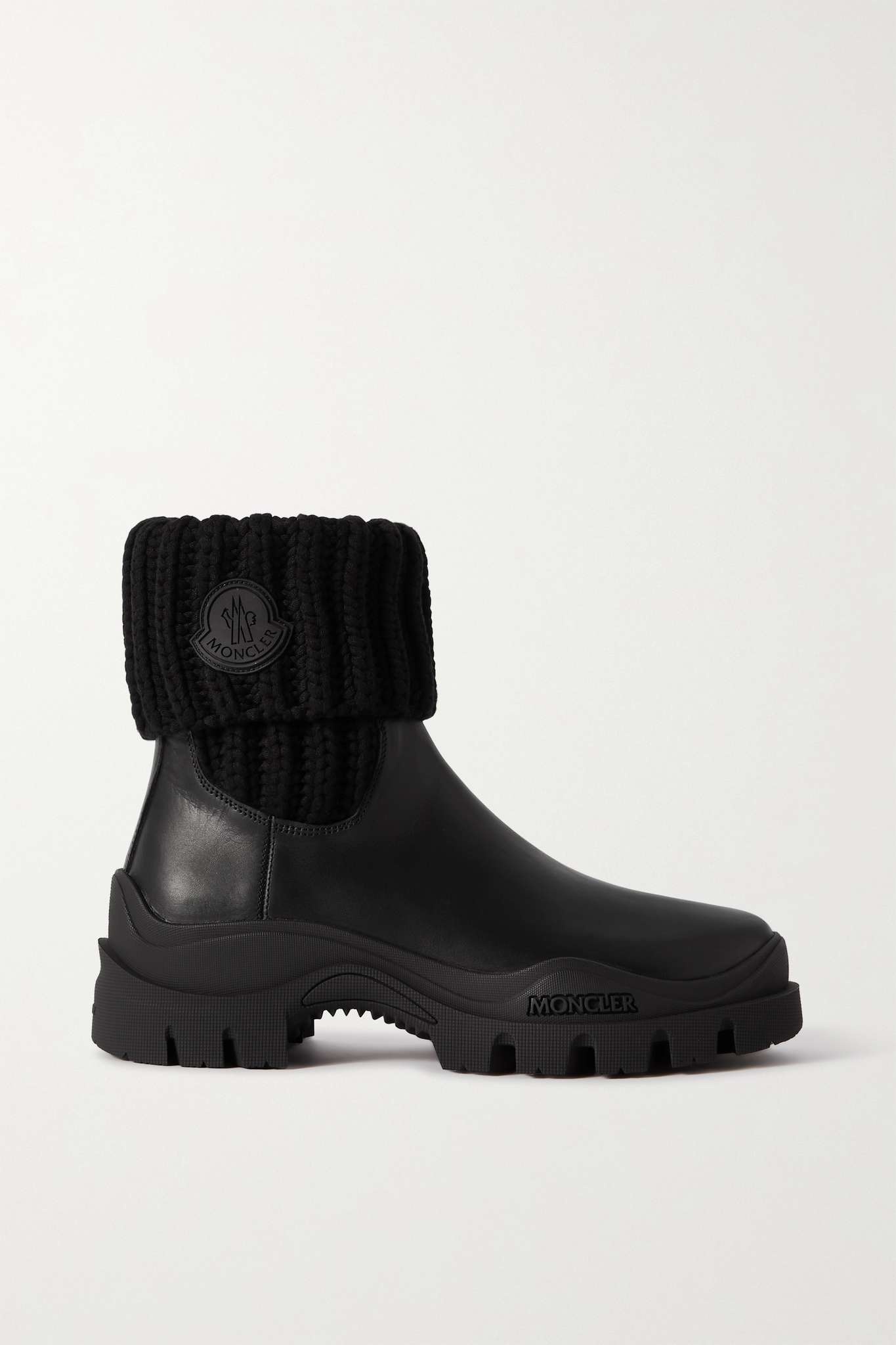 EDITORS'NOTES Moncler's 'Larue' ankle boots combine classic Chelsea styles with the durability of hiking boots. Crafted from supple black leather, they have cozy ribbed-knit cuffs appliquéd with the label's logo and chunky lugged soles that are perfect for tackling rough terrains. SIZE & FIT - Fits true to size, take your normal size - Italian sizing DETAILS & CARE - Rubber sole measures approximately 30mm/ 1 inch - Black ribbed-knit and leather (Cow) - Pull on