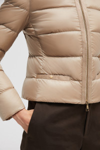 A classic silhouette is refreshed with a satin-finish in the Laurine short down jacket from the women's collection. Synonymous with functional style, the Laurine short puffer is crafted from lightweight nylon with a satin-like finish. The down jacket is further elevated through a ton-sur-ton grosgrain trim and a slim fit. Modern and sophisticated, the style layers perfectly over work and eveningwear. DETAILS - Nylon leger - Nylon leger lining - Down-filled - Zipper closure - Welt pockets - Grosgrain trim SIZE AND FIT - The model is wearing a size 0 and is 180 cm tall - The model measures: bust 78 cm, waist 58 cm, hips 88 cm - Slim fit COMPOSITION EXTERIOR: 100% Polyamide / Nylon; LINING: 100% Polyamide / Nylon; PADDING: 90% Down, 10% Feather Product code J20931A00101595FEU25 Made in Romania