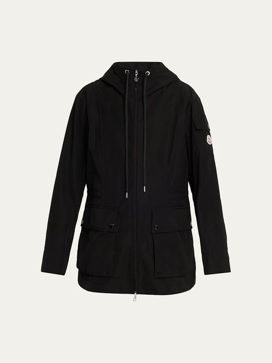 The "Leandro" parka by Moncler is crafted from technical poplin and boasts a feminine silhouette that can be cinched with an adjustable, interior drawstring. Signature embroidered logo patch on the left sleeve Hooded drawstring neckline Long sleeves; left sleeve pocket Snap patch pockets Classic fit Hem falls to the hip Twoway zipfront Polyester/cotton Lining: Polyester/cotton Dry clean or machine wash cold Made in Italy