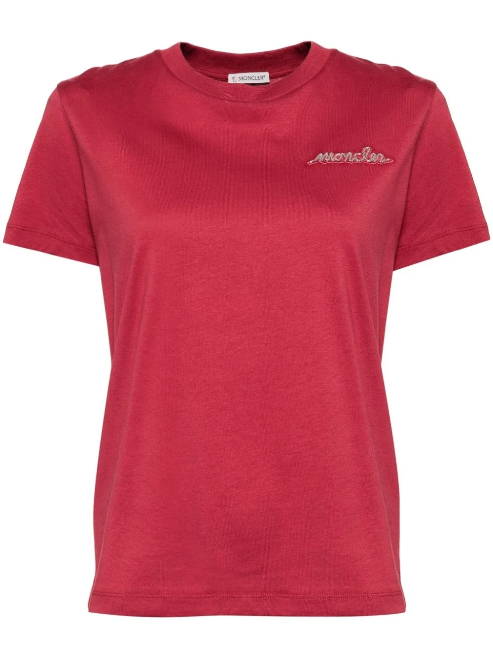 beaded logo T-shirt Highlights - Bordeaux red - Cotton - Jersey texture - Bead embellishment - Logo patch at the chest - Crew neck - Short sleeves - Straight hem Imported Composition Cotton 100% SIZE & FIT Model measurements Height 5 ft 10 in(1.77 m) Bust/Chest 27.95 in(71 cm) Hips 34.64 in(88 cm) Waist 22.83 in(58 cm) FittingInformation Designed for a slim fit that sits just away from the body offering a close yet comfortable fit Made from a midweight non-stretch fabric, this piece offers minimal elasticity when worn