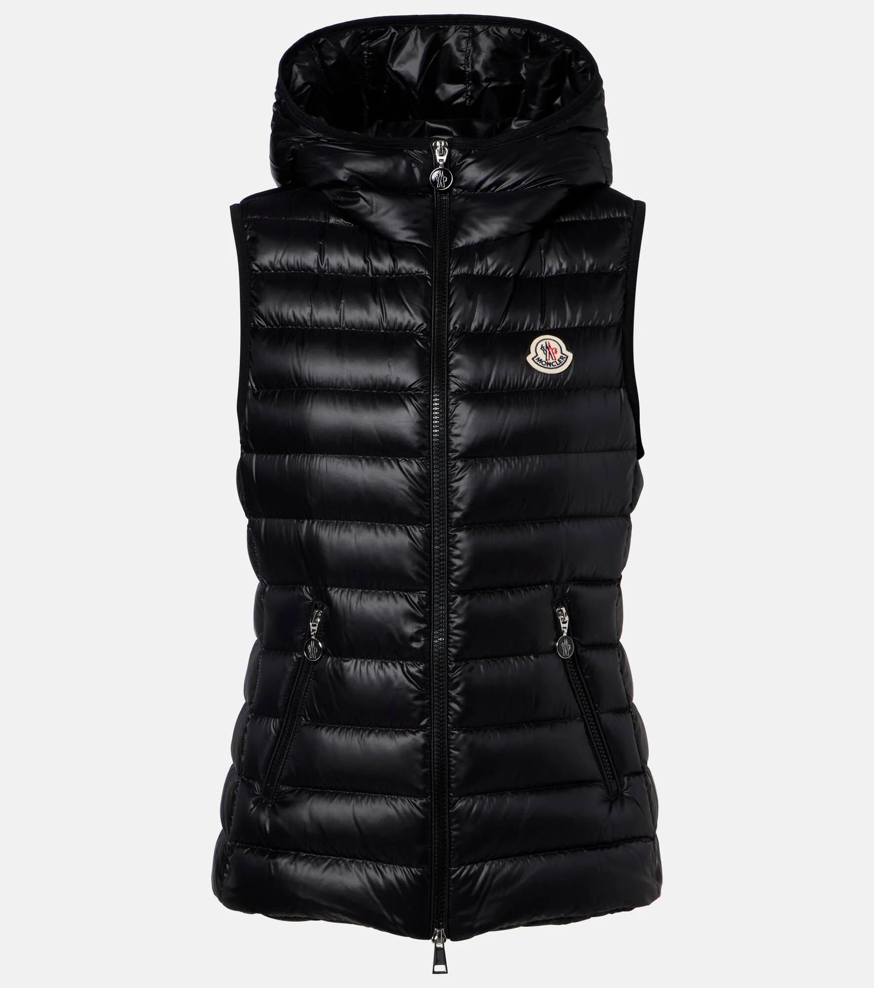 Committed to precision and performance, Moncler champions technical and innovative designs. This hooded vest is filled with warm down and features the brand's signature logo patch at the chest. Product Details - Material: 100% polyamide - Care instructions: hand wash - Made in Italy - Color: black - Designer color name: 999 - Item color: black - Lining: 100% polyamide - Other inner trims: 100% polyester - Filling: 90% down, 10% elastane - Contains non-textile parts of animal origin - Closure: two-way zipped front - Hood - Pockets: zipped pockets - Item number: P01127400 Size & Fit - Fits small to size - we recommend trying one size larger - Cinched waist - Non-stretchy fabric - Falls to the hip - The model seen in the picture is 178cm-5'10" and wearing a size 1