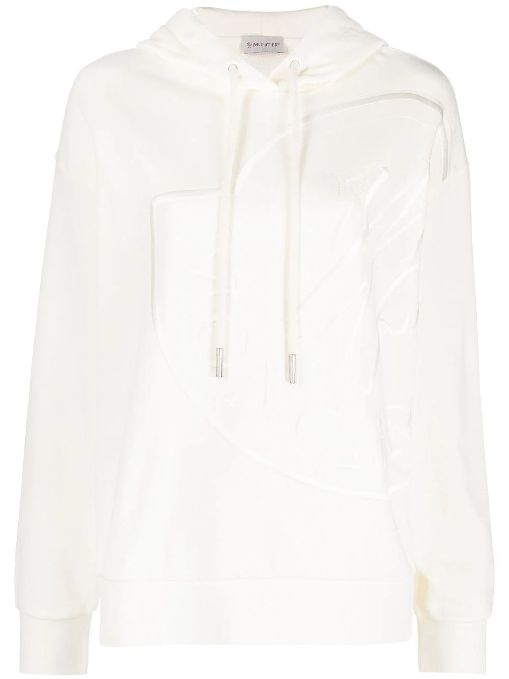 logo-embroidered cotton hoodie Moncler’s iconic logo combine’s the first letter of the brand’s name with an outlined rooster – the unofficial national symbol of France and a nod to the brand’s roots. An oversized iteration of the emblem is embroidered in asymmetric form at the side of this cotton-jersey hoodie. Highlights - White - Cotton - Jersey knit - Embroidered logo to the front - Drawstring hood - Drop shoulder - Long sleeves - Ribbed trim - Straight hem Imported Composition Outer: Cotton 91%, Polyamide 9% Lining: Cotton 100% SIZE & FIT Model measurements Height 5 ft 10 in(1.79 m) Bust/Chest 31.1 in(79 cm) Hips 35.03 in(89 cm) Waist 24.01 in(61 cm) FittingInformation Designed for a relaxed fit, this piece allows for comfort and movement when worn Made from a midweight non-stretch fabric, this piece offers minimal elasticity when worn This piece fits true to size – take your usual size Washing instructions Machine Wash