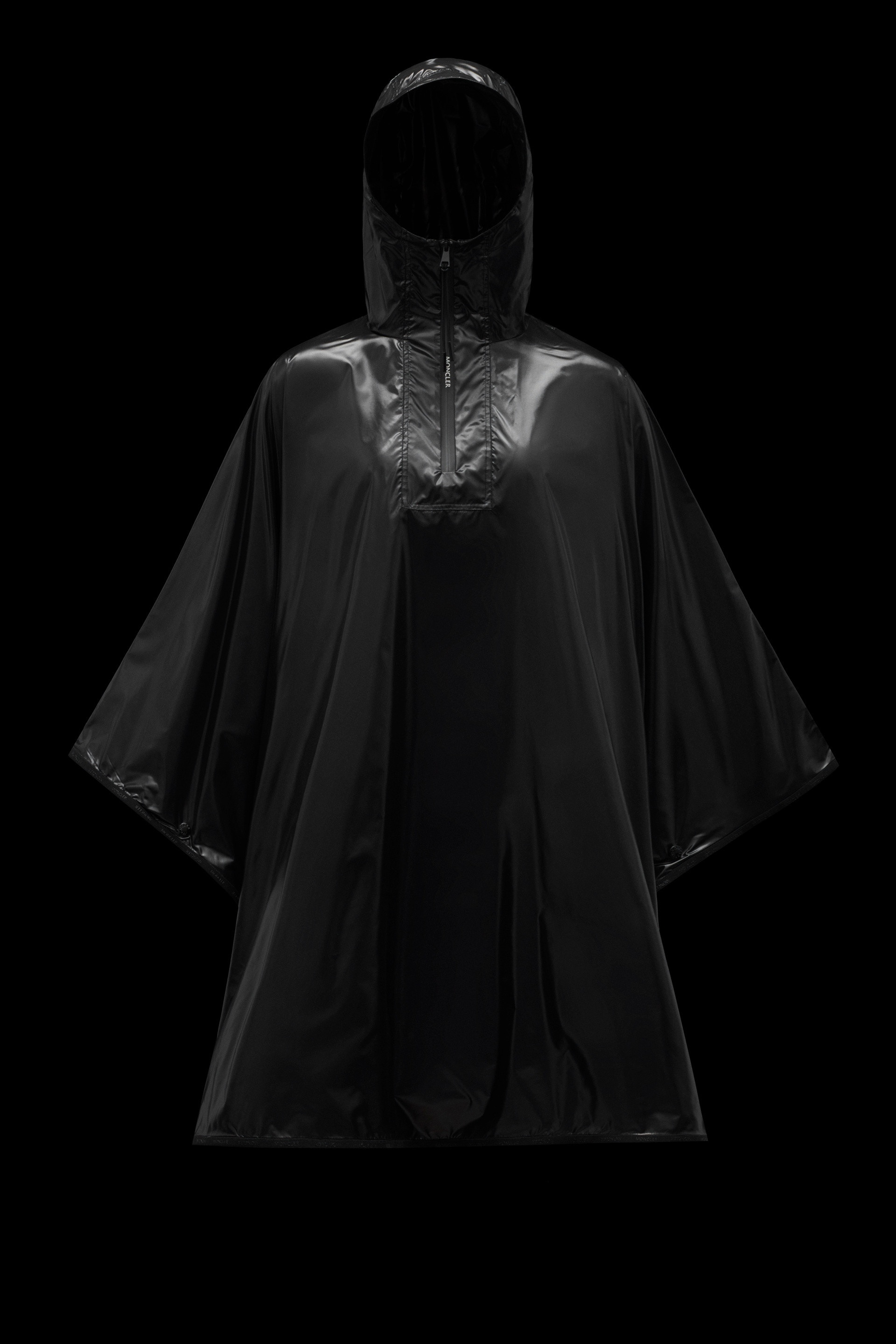 A Moncler rain poncho with a versatile design that easily folds inside its rear pocket and becomes a pouch. A modern version of the classic rain poncho, reinterpreted by Moncler with performance details and bright touches of color. This style has a wide A-line silhouette designed to be worn as outerwear over a sweatshirt or a down jacket. - Poncho for women - Packable style - Crafted in shiny nylon laqué - Front with half-zipper closure - High-neck with foldable hood - Kimono sleeves - Side vents with snap closures - Rear pocket with zipper closure - Long length - A-line SIZE AND FIT - The model is wearing a size 1 and is 176 cm tall COMPOSITION AND CARE HOOD LINING: 100% Polyamide / Nylon; HOOD: 100% Polyamide / Nylon; 1 MATERIAL: 100% Polyamide / Nylon; BASE FABRIC: 100% Polyamide / Nylon Hand wash; Do not bleach; Do not tumble dry; Ironing maximum temperature 110°C - without steam; Do not dry clean; Do not professionally wet clean; Flat dry in the shade; Do not twist or wring; Do not iron decorations; do not soak; It is advisable to wash and iron the garment on reverse. Product code G20933G0001168950999 Made in Romania