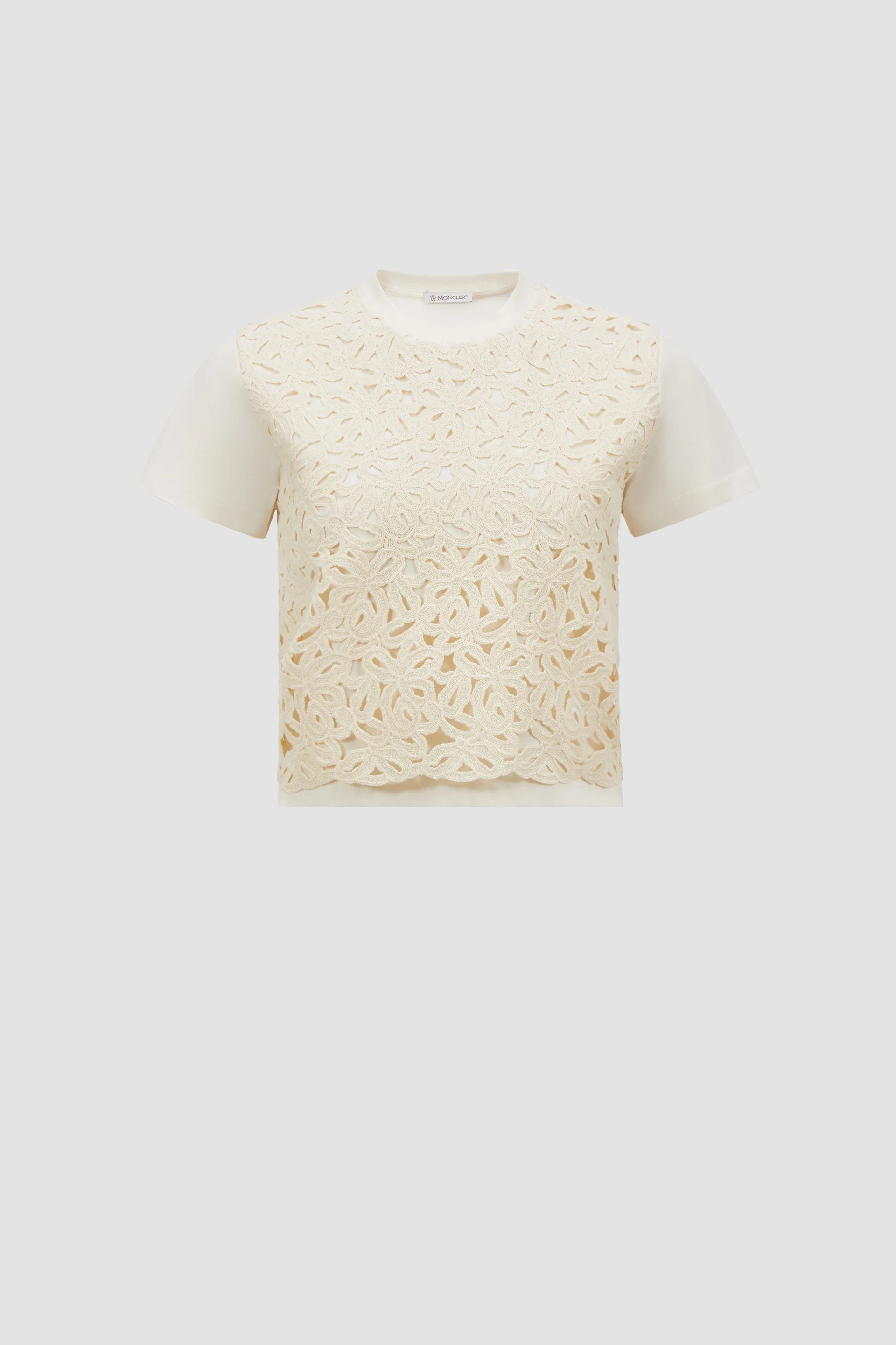 A precious take on a casual staple, this cotton t-shirt for women features a floral macrame front. Looking to spring and summer landscapes, this t-shirt boasts a floral design created using macrame. The cotton jersey top adds movement to sleek separates or can be paired with a matching skirt. DETAILS - Crafted from cotton jersey - Rib knit collar - Short sleeves - Flower macrame front SIZE AND FIT - The model is wearing a size XS and is 177 cm tall - Regular fit COMPOSITION BASE FABRIC: 100% Cotton; OUTER FRONT: 84% Cotton, 16% Polyester; FRONT LINING: 100% Cotton; Ribs: 100% Cotton Product code K10938C0005089AJU034 Made in Turkey