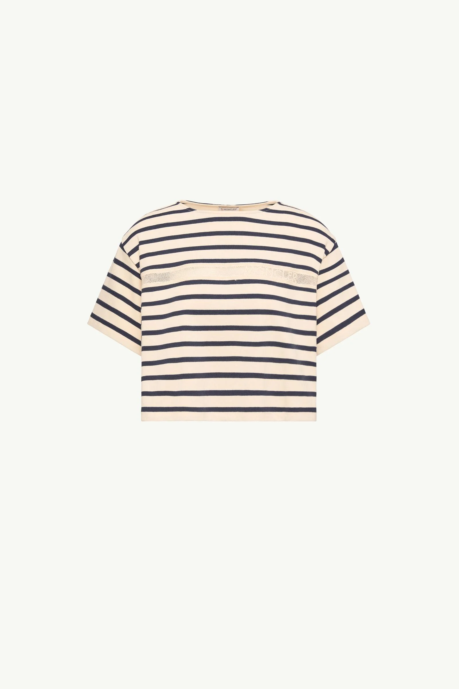 Long associated with the coast and days by the sea, a striped pattern sets this t-shirt for women apart. Inspired by a nautical summer mood, this ribbed top plays with texture and proportion. The boat neckline and cropped silhouette create a relaxed feel, while the macrame inlay on the front adds a refined touch. Designed to pair with the matching shorts from the collection. DETAILS - Crafted from cotton - Boat neckline - Short sleeves - Logo macrame detail - Logo patch SIZE AND FIT - The model is wearing a size XS and is 177 cm tall - Oversized fit COMPOSITION BASE FABRIC: 100% Cotton Product code L10938C0005089BEBF07 Made in Turkey