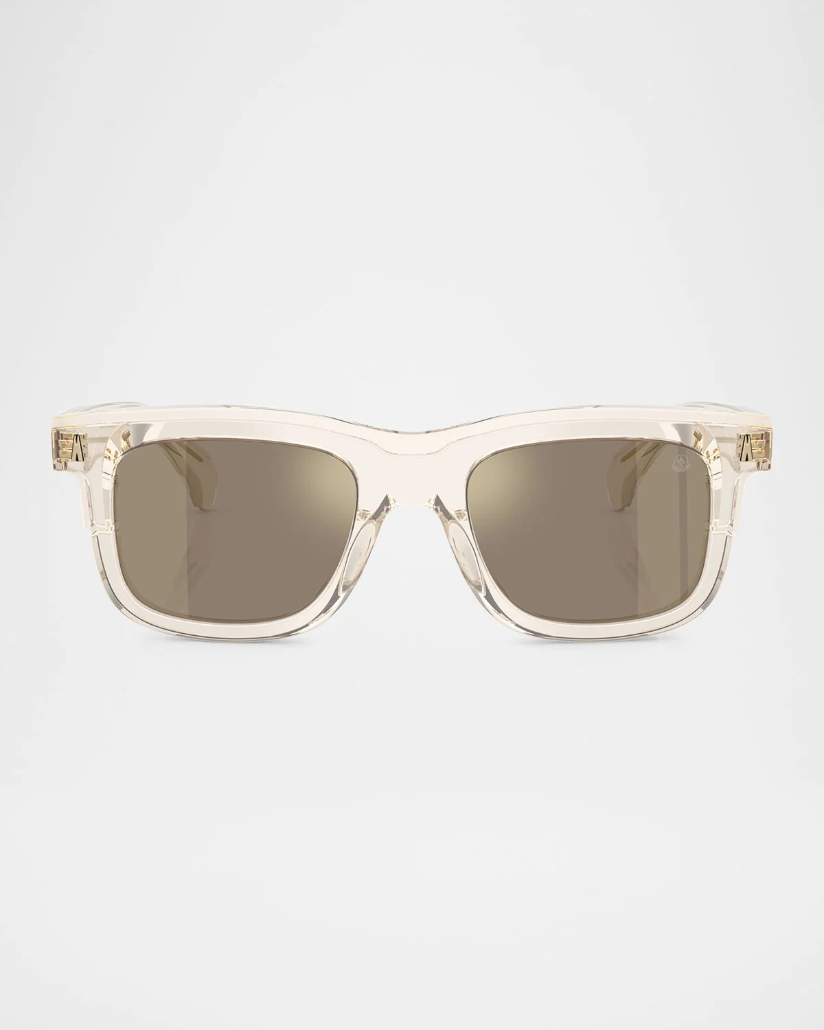 - Moncler "ME6004" square sunglasses in acetate - The Moncler Eclipse sunglasses collection embodies dynamic elegance with vintage-inspired elements and sophisticated details. Bold acetate shapes feature three-dimensional accents, while matte and shiny finishes contrast on the frame and temples. Customized hinges with a lasered moncler bell logo and a metal pin evoking the brand’s initials and mountainous origins add iconic touches. The visible metal core wire on the temples is adorned with the laser-etched moncler logo, featuring the signature rooster. These sunglasses perfectly blend classic power and high-quality craftsmanship, becoming a hallmark of the Moncler brand. Moncler ME6004 sunglasses feature a classic square shape with subtle metal detailing on the temples and rivets on the frame front. A timeless look with full-fitting execution. Me6004 features a transparent butter color on a square frame with light grey mirror gold lenses. - Each pair of sunglasses comes with a cleaning cloth and case to clean and protect your sunglasses from scratches and damage. - Lens/bridge/temple (in mm): 51-21-145 - Solid-color lenses - Thin, tapered arms - 100% UVA/UVB protection - Made in Italy - Proposition 65 warning for California residents