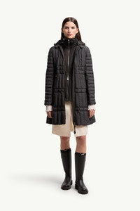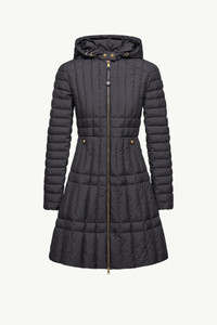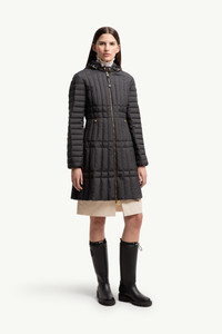 Anchored in the season's easy elegance, the women's Methelong reimagines the long down jacket through a tailored shape and graphic quilting. A play on length, the signature puffer jacket becomes a down coat in the Menthelong. Feminine proportions combine with cocooning comfort in a fit-and-flare shape while vertical quilting emphasizes the longline silhouette. A detachable hood completes the design. DETAILS - Crafted form polyester - Polyester trim - Down-filled - Detachable hood - Zipper closure - Pockets with snap button closure - Leather logo patch SIZE AND FIT - The model is wearing a size 0 and is 177 cm tall - Slim fit - Fitted shoulders and bust - Slim waist - Length (collar to hem): 92 cm COMPOSITION EXTERIOR: 100% Polyester; LINING: 100% Polyester; HOOD LINING: 100% Polyester; PADDING: 90% Down, 10% Feather; DETAILS PADDING: 100% Polyester;LEATHER TAG: CALF; LEATHER INSERTS: CALF Product code L10931C00011597YW999 Made in Romania