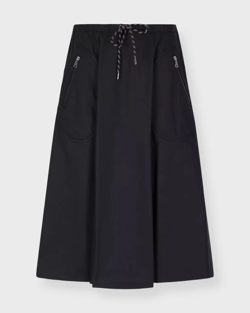Skirt Midi Drawstring Cotton from Moncler. A modern take on utility defined by fluid lines that naturally enhance the silhouette. Crafted from a refined cotton and nylon blend, the skirt features an elasticated waistband with a contrasting drawstring tie. Spacious zip pockets add a functional, contemporary edge, while the midi length and softly flared shape create an elegant drape. Size and Fit - Fits true to size, choose your usual size - The model is 172 cm tall and is wearing size S Specification - Article number - ID: 178271-256 - Brand: Moncler - Color: Navy - Washing Instructions: Machine wash - Made of: 64% Cotton, 36% Polyamide