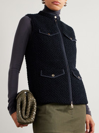 Tailored from wool-boucle, Moncler's 'Fallavier' vest feels less sporty than the label's typical styles. It's filled with down for lightweight insulation, paneled with quilted shell across the lower back and appliqued with a logo at the nape. Size & Fit - Size 0 = XS, 1 = S, 2 = M, 3 = L, 4 = XL, 5 = XXL, 6 = 3XL - Fits true to size, take your normal size - Designed for a slim fit - Mid-weight, non-stretchy fabric - Model is 177cm/ 5'10" and is wearing the designer's size 1 Model measurements: - Bust: 85cm/ 33.5" - Waist: 65cm/ 25.5" - Hip: 91cm/ 36" Details & Care - Navy wool-boucle and shell - Snap and two-way zip fastening at front - Fabric1: 100% wool; fabric2: 100% polyester; trim: 100% leather (Calf); filling: 90% down, 10% feathers (Duck); lining: 100% polyester - Fully lined - Dry clean