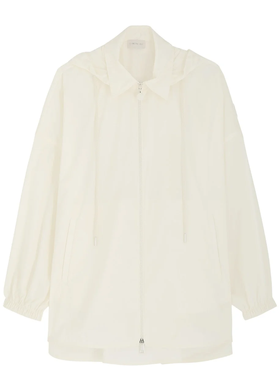 Info & Care Moncler shell shirt; Drawstring hood, dropped shoulders, designer applique at sleeve, elasticated cuffs, side slip pockets, gathered detail at back, side splits at curved hem; Two-way zip fastening at front 100% polyamide Machine wash Size & Fit Length shoulder to hem: 27.5 inches/ 70cm Midweight Regular fit Model is 5'9"/ 175cm and wears a size;IT40