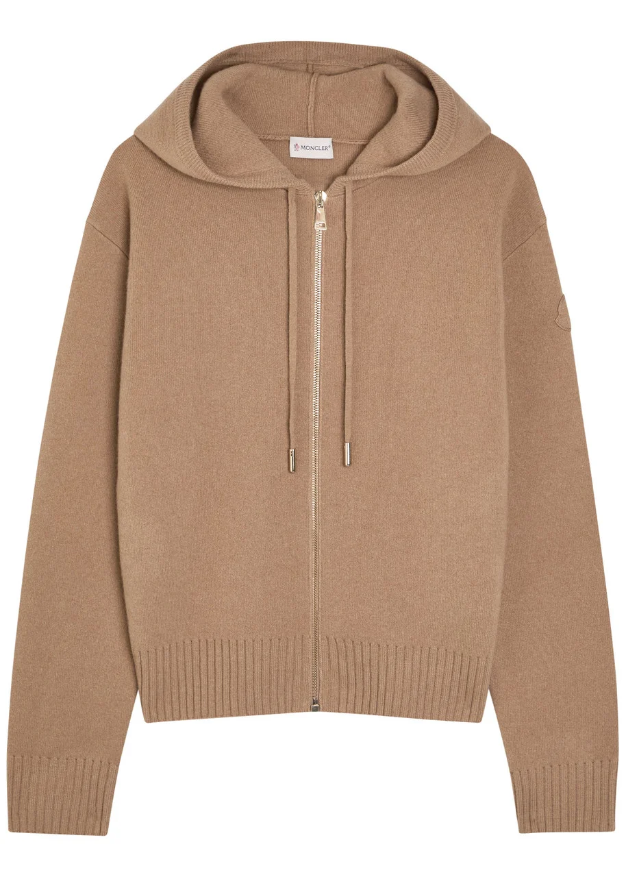 Info & Care Moncler wool and cashmere-blend cardigan Drawstring hood, ribbed trims Zip fastening through front 70% virgin wool, 30% cashmere Dry clean Size & Fit Length shoulder to hem: 21 inches/ 53.5cm Midweight Regular fit Model is 5'8"/ 173cm and wears a size small