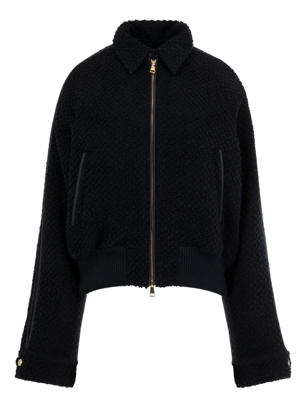 JUVIGNY hooded bomber jacket Highlights - Navy blue - Boucle texture - Concealed zip fastening - Ribbed hem - Ribbed cuffs - Detachable hood - Sleeve panelling Imported Composition Virgin Wool 70%, Polyester 30% Washing instructions Read Manufacturer Guidelines