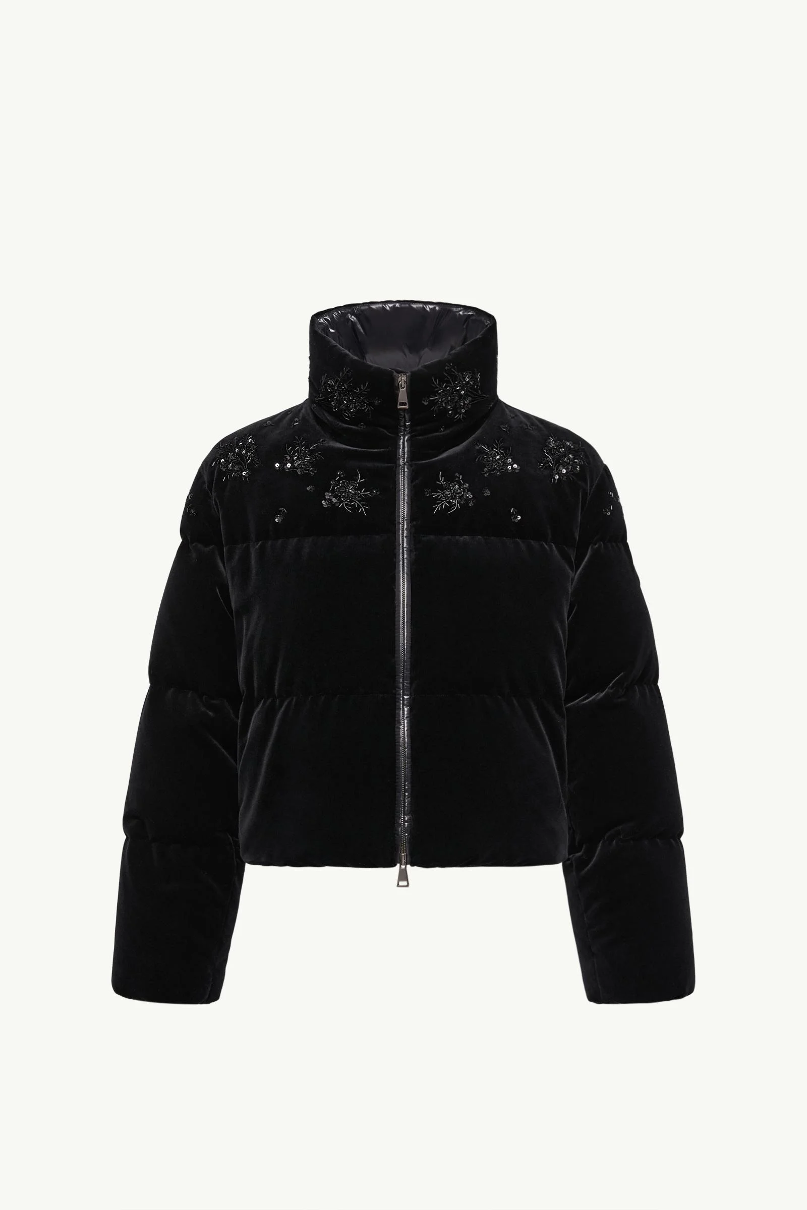 A refined take on a classic silhouette, the Nelles short down jacket for women stands out with precious sequin-embroidered flowers. A nod to the beauty of the natural world, the Nelles down jacket is adorned with sequin-embroidered flowers. The short puffer is crafted from velvet, enhancing its plush, tactile effect. Featured in a relaxed fit, a stand collar and adjustable hemline infuse the standout design with warmth and comfort. DETAILS - Crafted from velvet - Nylon laque lining - Down-filled - Zipper closure - Zipped pockets - Hem with drawstring fastening - Embroidered sequins - Logo patch SIZE AND FIT - Loose fit - Length (collar to hem): 52 cm COMPOSITION EXTERIOR: 100% Cotton; LINING: 100% Polyamide / Nylon; PADDING: 90% Down, 10% Feather Product code K20931A0024789B7Y999 Made in Italy