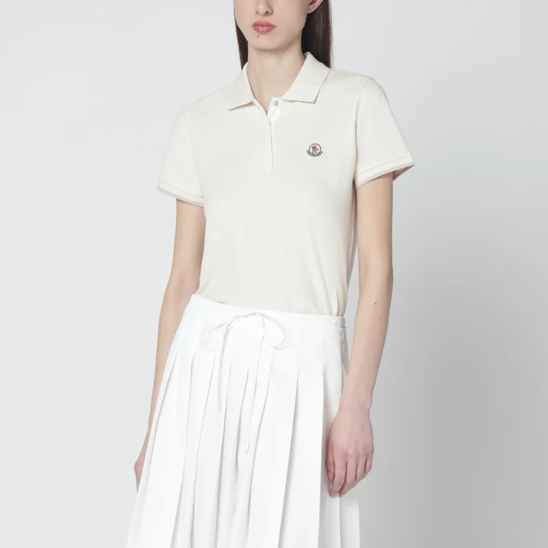 White cotton polo shirt by Moncler, featuring a classic collar, three snap buttons on the front, logo patch on the chest, short sleeves and straight hem.