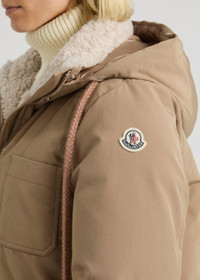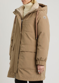 Style Notes Moncler's Urfe parka will be a hardworking and practical addition to your winter wardrobe. Crafted from a water-repellent fabric and padded with warming down and feathers, this hooded style features a soft faux shearling lining and features spacious utilitarian-style pockets. Info & Care Moncler shell parka Water repellent, padded, drawstring hood, faux shearling collar and internal trim, designer applique at arm, press-stud fastening strap at elasticated cuffs, chest patch pocket, two press-stud fastening front flap pockets, concealed toggle-fastening hem, fully lined Partially concealed zip and press-stud fastenings through front 85% polyester, 15% cotton; lining: 100% polyester; filling: 90% down, 10% feather Hand wash Size & Fit Length shoulder to hem: 34.5 inches/ 87.5cm Midweight Relaxed fit Model is 5'9"/ 175cm and wears a size 0