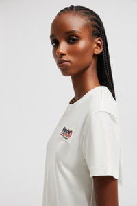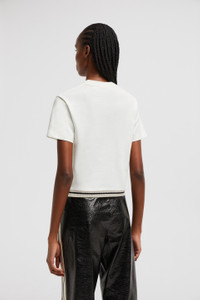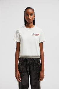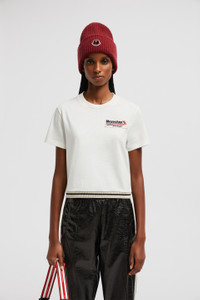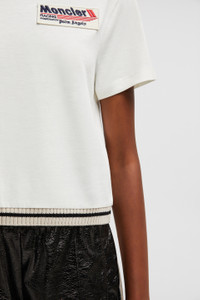 A Moncler x Palm Angels design, this women's t-shirt channels the collection's racetrack influences with an embroidered patch. A nod to the world of motorsports, this Moncler x Palm Angels t-shirt features a racing-inspired logo patch. The Moncler Genius crew neck is crafted from soft cotton jersey. A casual essential, the design can be paired with leisurewear from the collection with matching logo details. DETAILS - Crafted from cotton jersey - Crew neck - Striped knit hem - Embroidered logo patch SIZE AND FIT - The female model is wearing a size XS and is 176 cm tall - The female model measures: bust 77 cm, waist 57 cm, hips 86 cm - The female model is wearing a size XS and is 176 cm tall - The female model measures: bust 80 cm, waist 60 cm, hips 88 cm - Slim fit COMPOSITION BASE FABRIC: 100% Cotton; Collar rib: 100% Cotton; Hem rib: 100% Cotton Product code J209L8C0000289AKK031 Made in Turkey