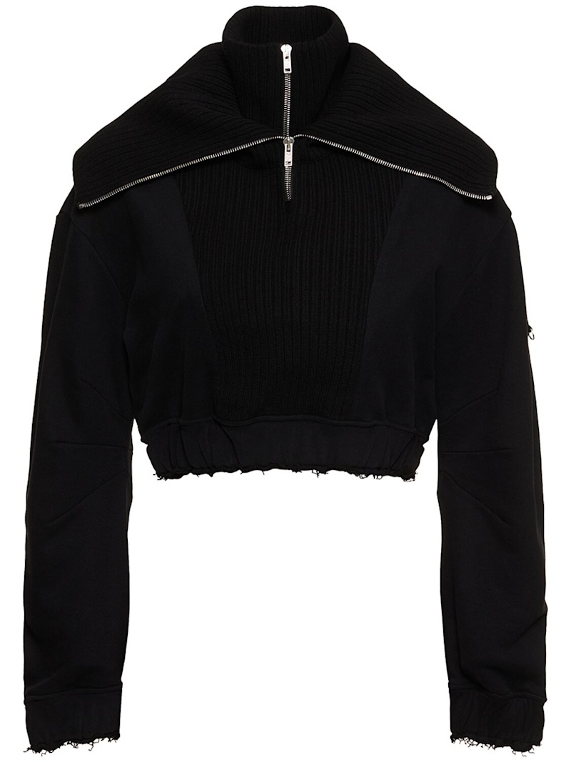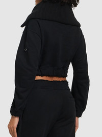 DETAILS - Brushed frosted sweatshirt cotton - Turtleneck - 2x1 flat ribbed knit - Gauge 7 - Tonal embroidered Moncler Willow Smith coq logo on left sleeve - Moncler Willow Smith nickel-finish ring under the coq logo - Cotton ribbon - Gathered raw-edged cuffs and hem - Metal zip closure - Loose fit - Model is wearing a size S - Composition: - Main: 100% Cotton - Details: Virgin Wool