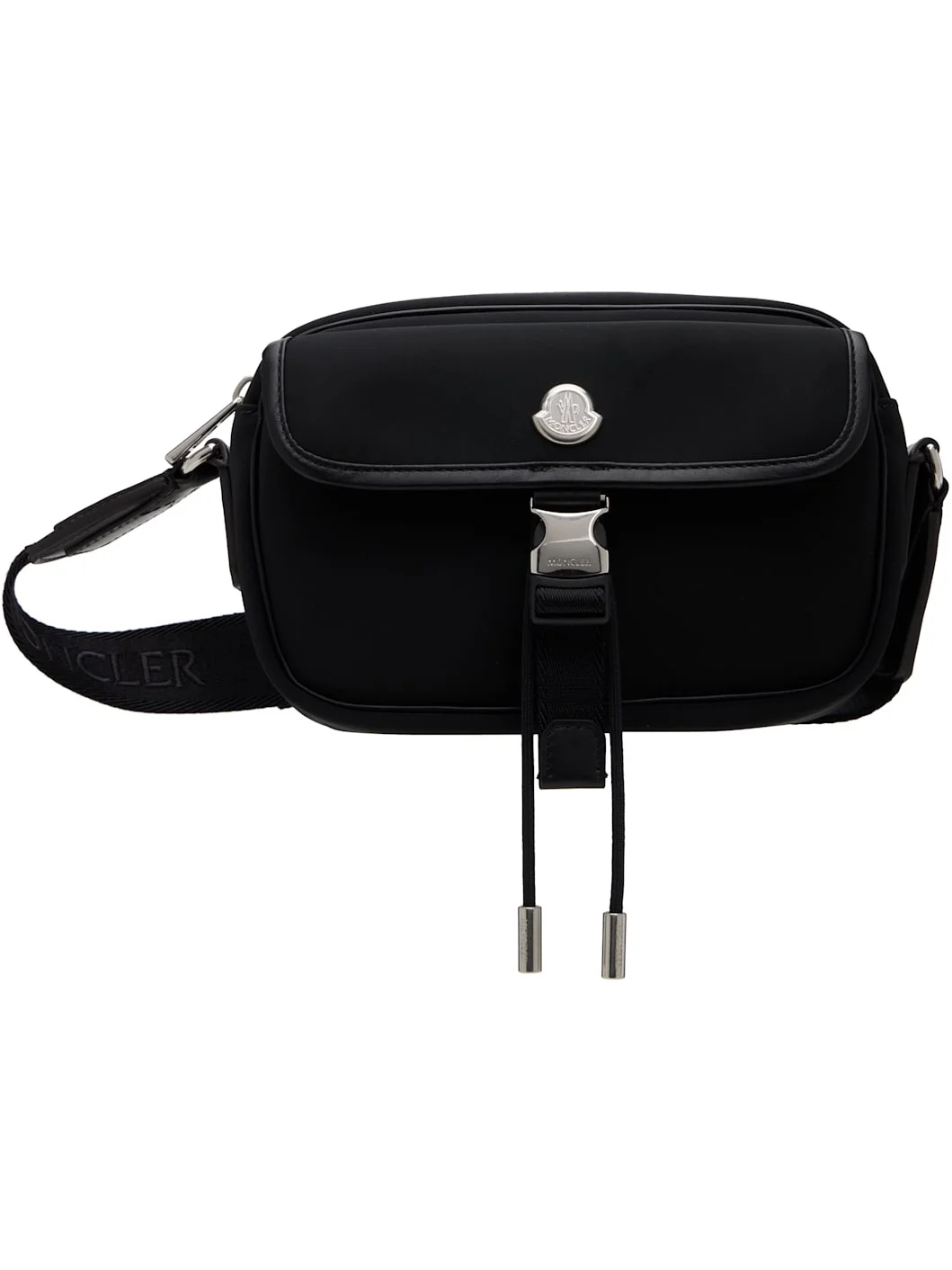 Taffeta shoulder bag in black. · Buffed leather trim throughout · Adjustable logo-woven webbing crossbody strap · Logo plaque and flap pocket at face · Zip closure · Zip pocket at interior · Moire lining · Logo-engraved silver-tone hardware · H5.5" x W7.5" x D2" Supplier color: Black Body: 100% polyester. Lining: 100% polyamide. Made in Italy 251111F045000