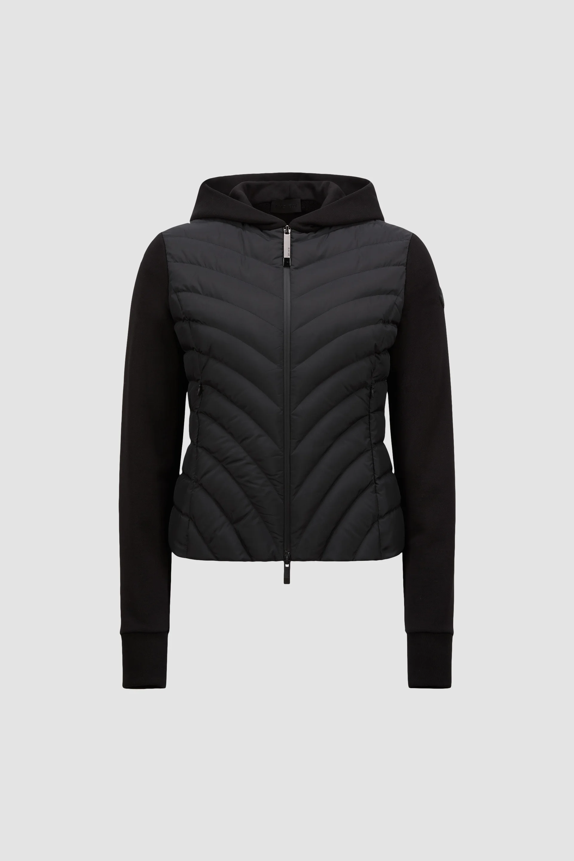 A feminine piece, this padded cotton zip-up hoodie for women is characterized by a silhouette-enhancing construction. Transcending seasons, this padded hoodie's down-filled and padded front allows it to easily double as outerwear. The hooded sweatshirt features diagonal quilting, creating a tailored effect. DETAILS - Crafted from cotton fleece - Down-filled and padded recycled micro soft nylon front - Adjustable hood - Zipper closure - Zipped pockets - Silicone logo patch SIZE AND FIT - The model is wearing a size XS and is 181 cm tall - The model measures: bust 84 cm, waist 60 cm, hips 89 cm - Regular fit COMPOSITION BASE FABRIC: 100% Cotton; OUTER FRONT: 100% Polyester; FRONT LINING: 100% Polyester; HOOD: 100% Cotton; HOOD LINING: 100% Cotton; Ribs: 95% Cotton, 5% Elastane / Spandex; PADDING: 90% Down, 10% Feather; BODY PADDING: 100% Polyester Product code K10938G00020809KZ999 Made in Moldova