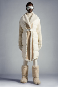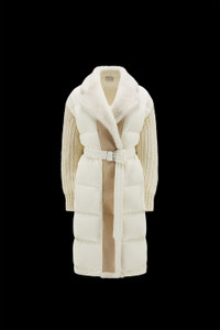 Enriched with a shearling trim, this long, padded wool cardigan for women is emblematic of functional luxury. Designed to provide warmth, this long cardigan is crafted from a soft wool blend. The heavy knit is enhanced with a down-filled front, allowing it to double as outerwear during the milder days. The plush cardigan is enriched with a luxurious shearling trim. - Crafted from a chain stitch wool blend and longue saison - Stocking-stitched - Gauge 3 - Longue saison lining - Down-filled - Nylon front, lining, yoke and belt - Shearling lapels and facing - Quilted nylon belt with metal buckle - Front pockets - Embroidered grosgrain logo SIZE AND FIT - The model is wearing a size XS and is 180 cm tall - The model measures: chest 78 cm, waist 61 cm, hips 87 cm - Oversized fit COMPOSITION AND CARE LINING: 70% Polyamide / Nylon, 30% Polyester; PADDING: 90% Down, 10% Feather; DETAILS PADDING: 100% Polyester; 1 MATERIAL: 70% Polyamide / Nylon, 30% Polyester; BASE FABRIC: 90% Virgin wool, 10% Polyamide / Nylon;Fur 1: SHEEP; Fur 2: SHEEP; Fur 3: SHEEP Do not wash; Do not bleach; Do not tumble dry; Ironing maximum temperature 110°C - without steam; Dry cleaning with hydrocarbons - mild process; Do not professionally wet clean; Flat dry in the shade; Wash separately; It is advisable to wash and iron with the garment on reverse. Product code H20939B00022M1965002 Made in Italy
