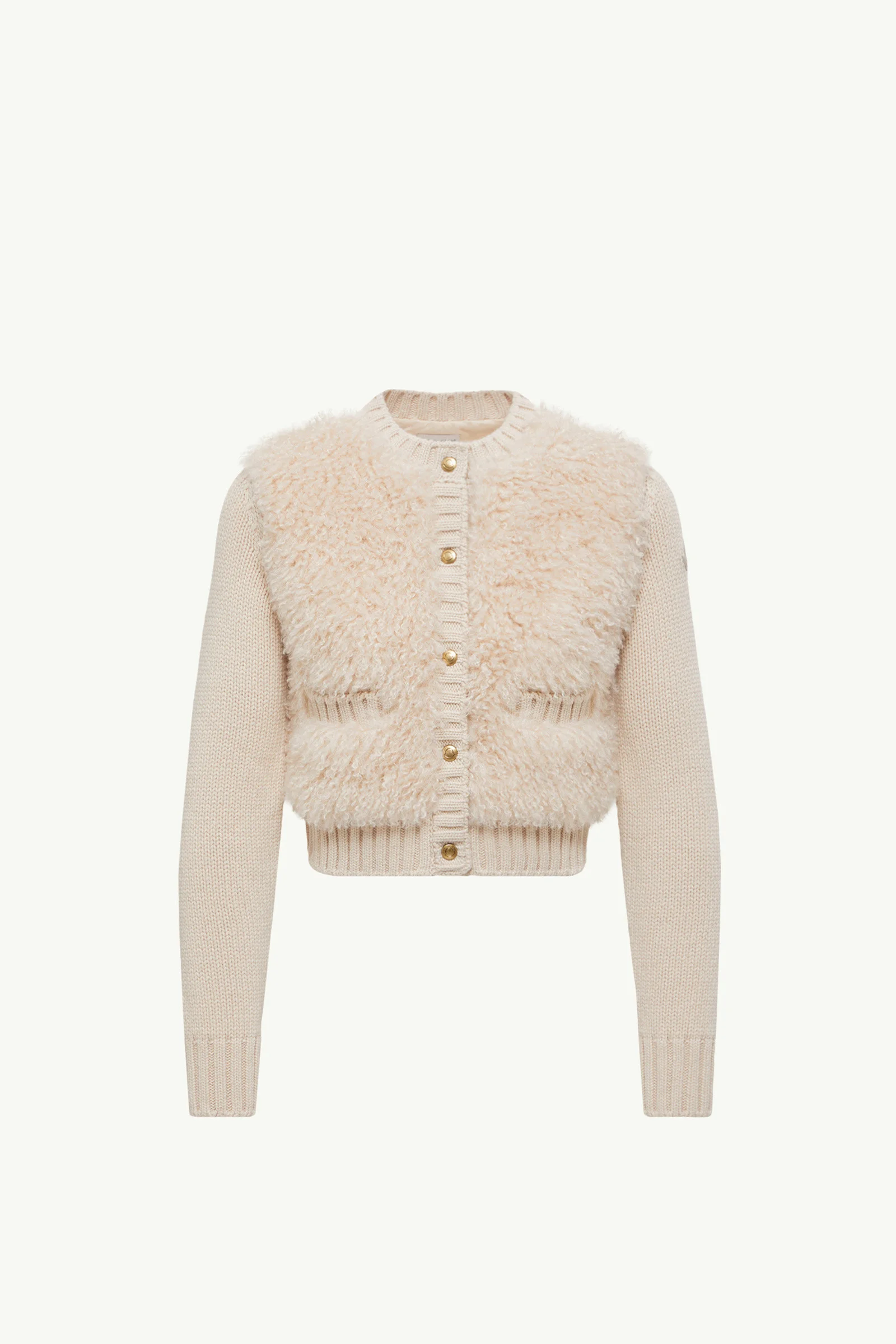Easily worn in any season, this padded cardigan from the women's collection is characterized by plush fabrics. A year-round essential, this cardigan is enhanced with a down-filled back in lightweight nylon. The crew neck is knit from soft wool, further accentuated by a plush teddy front. DETAILS - Crafted from carded wool - Longue saison lining - Teddy front - Down-filled longue saison back - Stockinette stitch and rib knit - Gauge 3 - Crew neck - Snap button closure - Front pockets - Leather logo patch SIZE AND FIT - The model is wearing a size XS and is 177 cm tall - Slim fit COMPOSITION OUTER BACK: 100% Polyamide / Nylon; OUTER FRONT: 100% Polyester; BASE FABRIC: 100% Virgin wool; FRONT LINING: 100% Polyamide / Nylon; BACK LINING: 100% Polyamide / Nylon; PADDING: 90% Down, 10% Feather;LEATHER TAG: CALF Product code K20939B00040M124121I Made in Romania