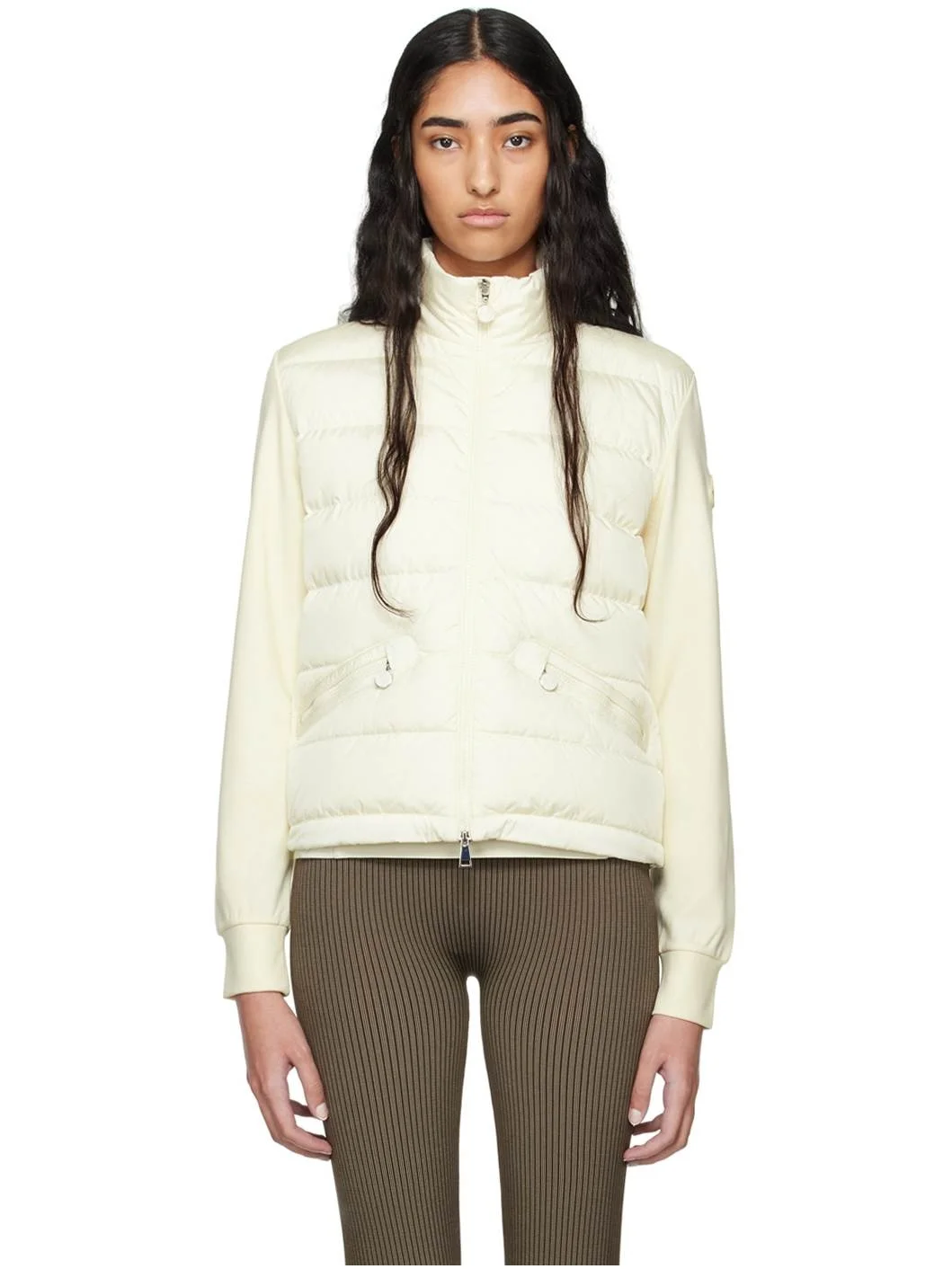 Stretch viscose jersey and DIST-certified down-filled quilted nylon satin cardigan. · Paneled construction · Stand collar · Two-way zip closure · Zip pockets · Bungee-style drawstring at hem · Tricolor felted logo patch at sleeve · Rib knit cuffs · Partially lined Supplier color: Silk white Fill: 90% goose down, 10% feather. Body 1: 71% viscose, 24% polyamide, 5% elastane. Body 2: 100% polyamide. Lining: 100% polyamide. Made in Moldova 242111F061029